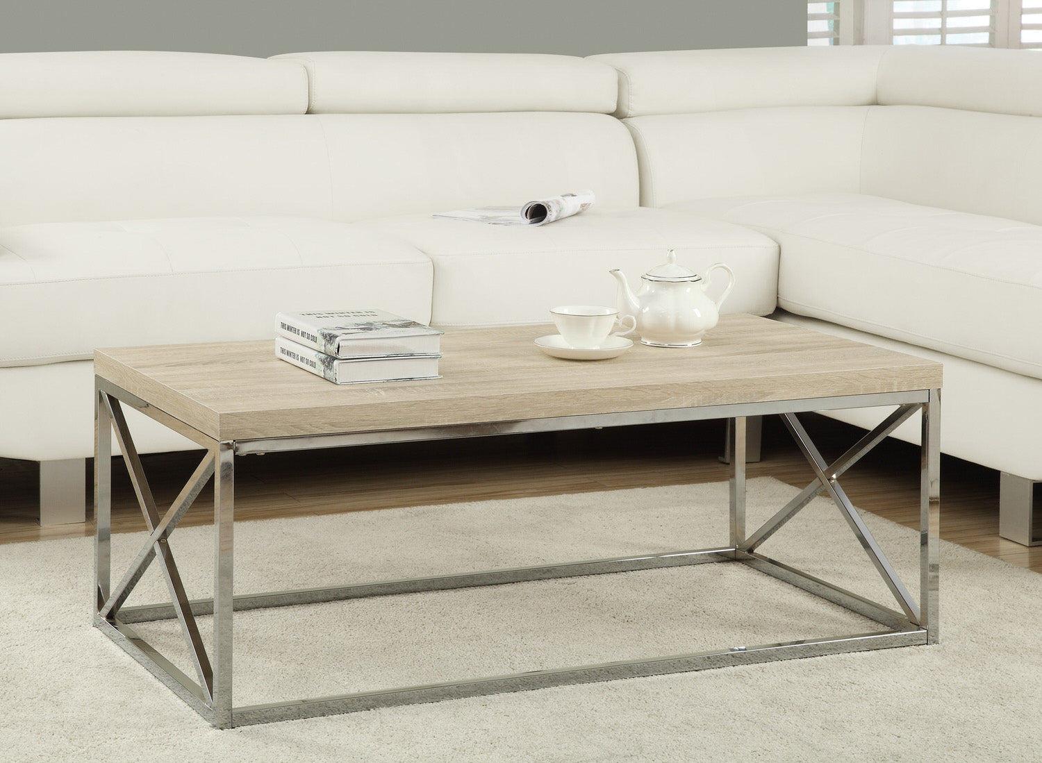 With a natural wood-look surface and a stylish, thick paneled design this cocktail table gives an exceptional look to any room. The modern rectangular shape and criss-cross chrome metal base provides sturdy support. Use this multi-functional coffee table to compliment your living room, family room, den or office space.