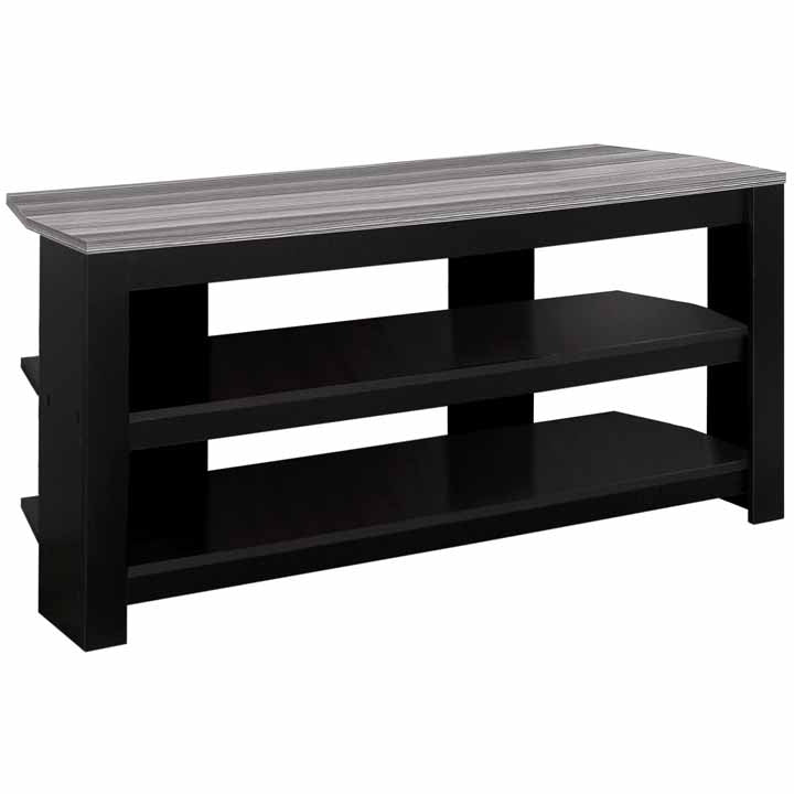 Two open concept shelves for audio visual components, gaming devicesAccommodates all TV sizes with a center standTwo tone finish in black and grey reclaimed wood lookContemporary/transitional style blends well with any decorFinished on all sides