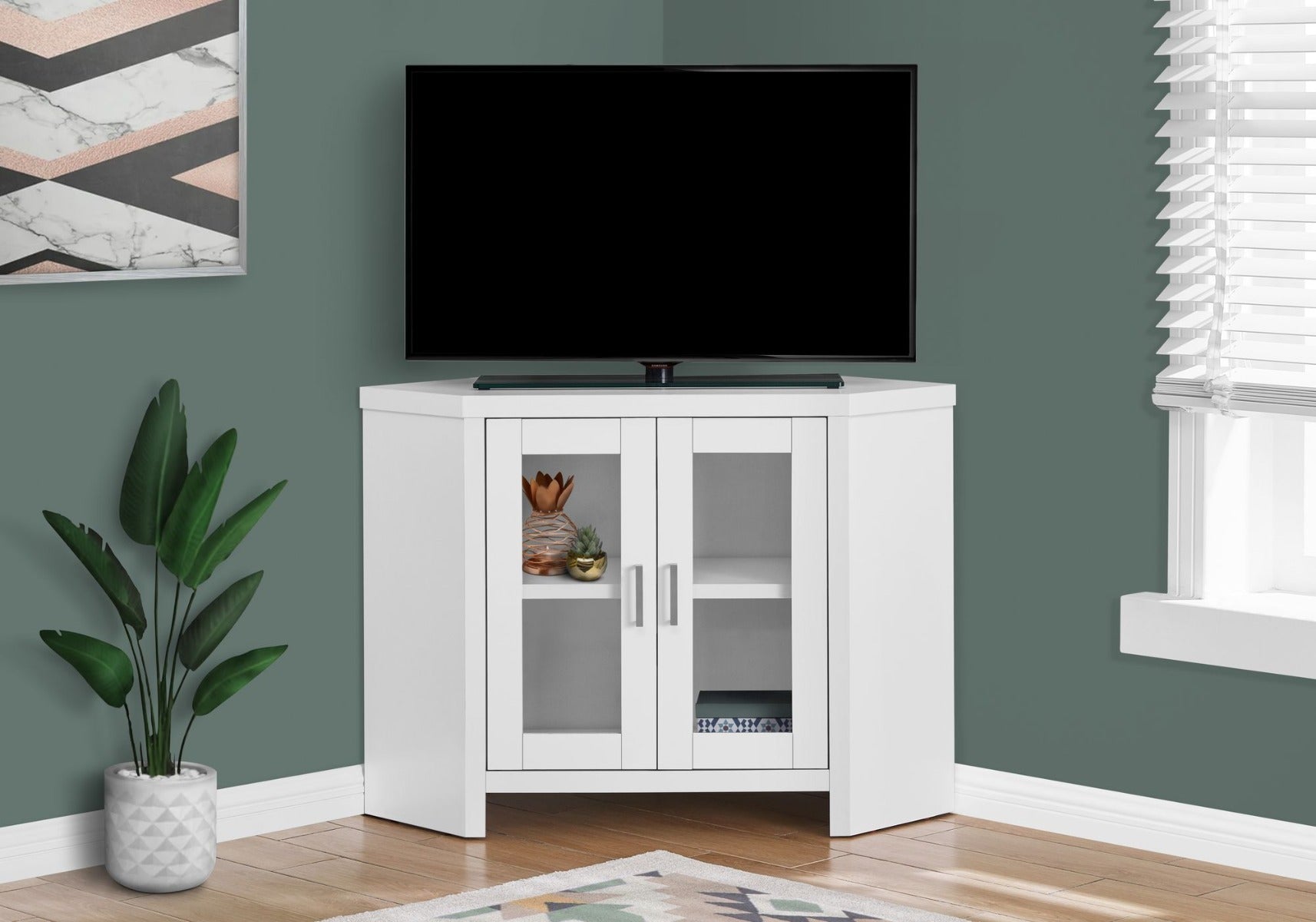 In a corner design with two glass cabinet doors to keep components organized, space saving is no issue. This sleek white TV stand is the versatile media storage solution you need in the living room of your small home, condo, apartment or dorm room. Freeing up valuable space, this unit accommodates all TV sizes equipped with a center stand. Keep in mind, all the cables of your electronic components can be kept organized and hidden behind the glass doors with help from the fixed shelf.