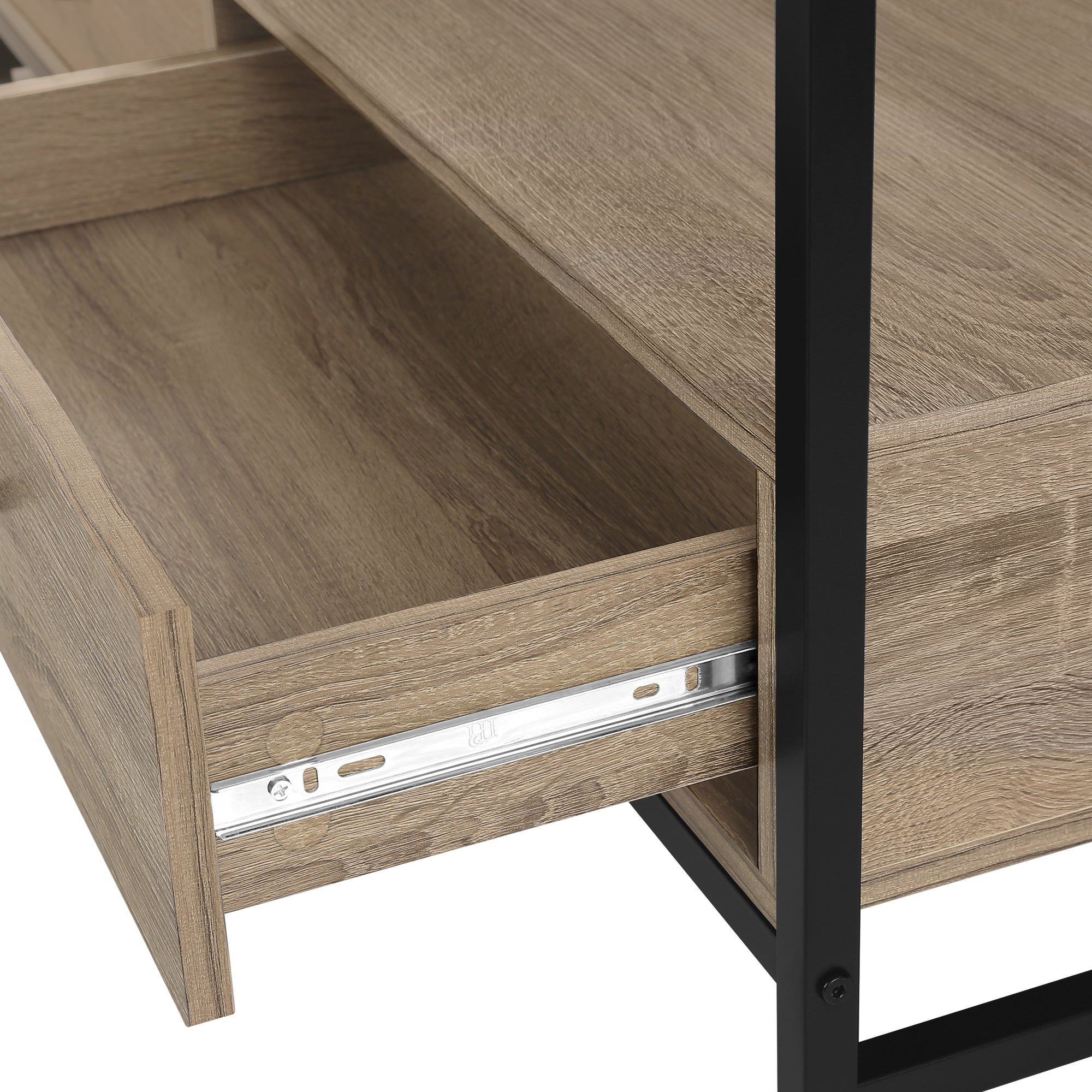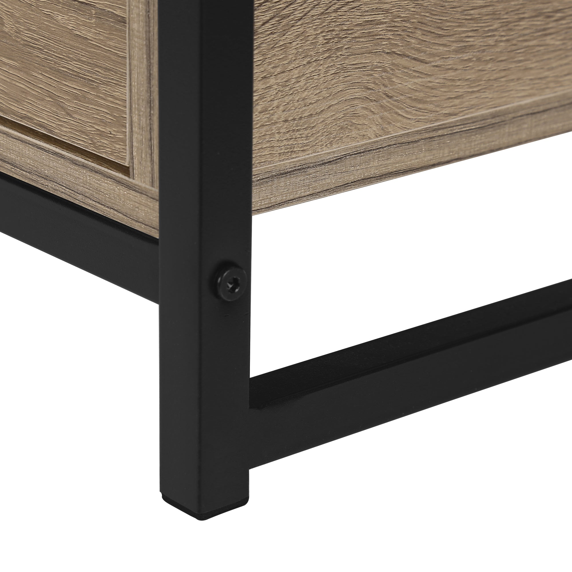 Double up on storage with this TV stand that offers 2 tiers and 2 drawers to neatly organize your electronics and other items. The spacious top shelf with thick-panel construction accommodates most TVs when centered. Below, the open-concept shelf provides ample room for audio-visual components and easy cable management, while the 2 drawers can store remotes, game controllers, or entertainment center accessories. The shelves and drawers in a dark taupe wood-look finish are supported by a sleek black metal frame that gives a modern look. With its space-saving design, this media console is a great choice for a living room or bedroom in an apartment, condo, or small home.