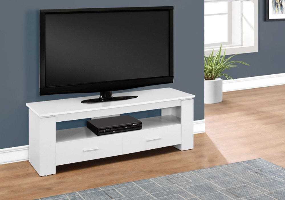 Bring a modern statement to your living room, family room, or den with this sleek thick panelled TV stand in a smooth white finish. The roomy top surface can easily accommodate any TV size with a center stand and a long open shelf space underneath to place audio/visual equipment and gaming accessories. The 2 large gliding storage drawers accented with sleek silver colored handles, are perfect to keep books, cds, dvds, or media components neatly in one place. Watch this contemporary TV console unit instantly upgrade your entertainment space! Full assembly instructions are included.