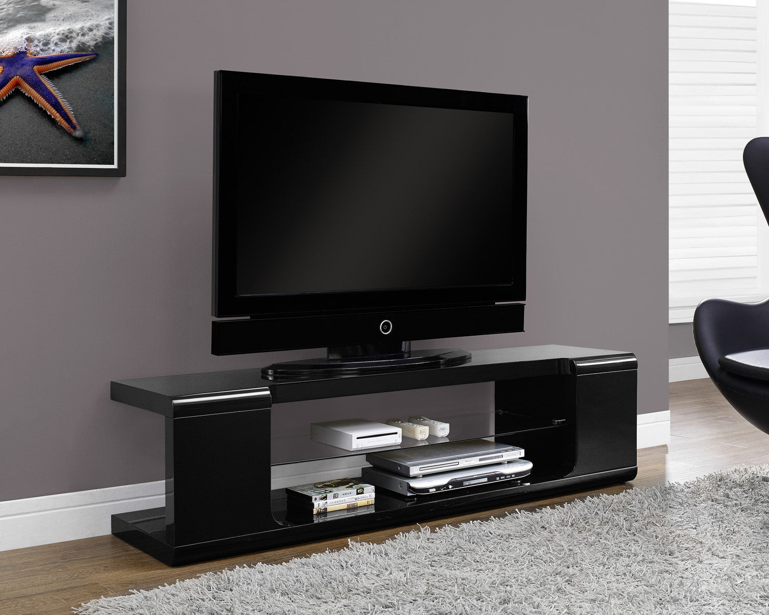 Modernize your space with this contemporary style TV console. Featuring a solid 60"L top and a tempered glass shelf along with a bottom shelf to place your audio/visual/gaming components or decorative objects. This durable console designed with retro style rounded edges and finished in a sleek glossy black, fits perfectly in a living room, den, or basement to showcase your latest high tech gadgets. Accommodates all TV sizes with a center stand.