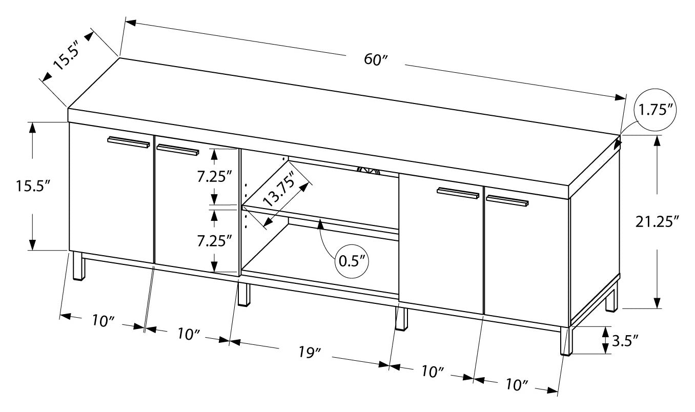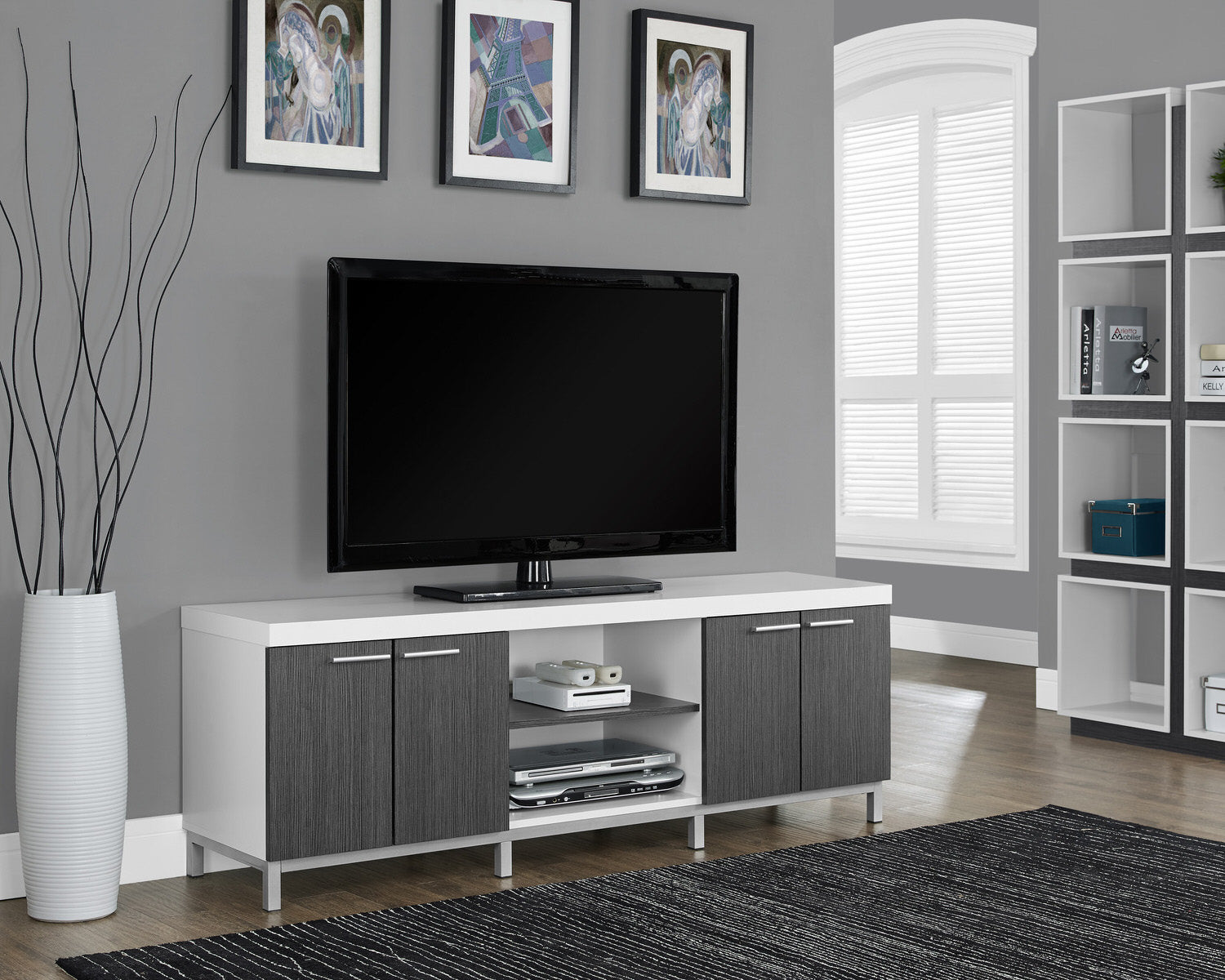 Complete the look of your living space with this contemporary two-tone TV console. The thick paneled construction finished in a bright white frame paired with grey cabinets, is accented with sleek silver colored handles and supported by stylish silver metal legs. Featuring a table top that can accommodate any TV size with a center stand, two open adjustable storage shelves, two double door cabinets each with an adjustable shelf inside, and a pre-drilled hole behind the center shelf for efficient wire management, this TV stand will meet all your media storage needs in style.