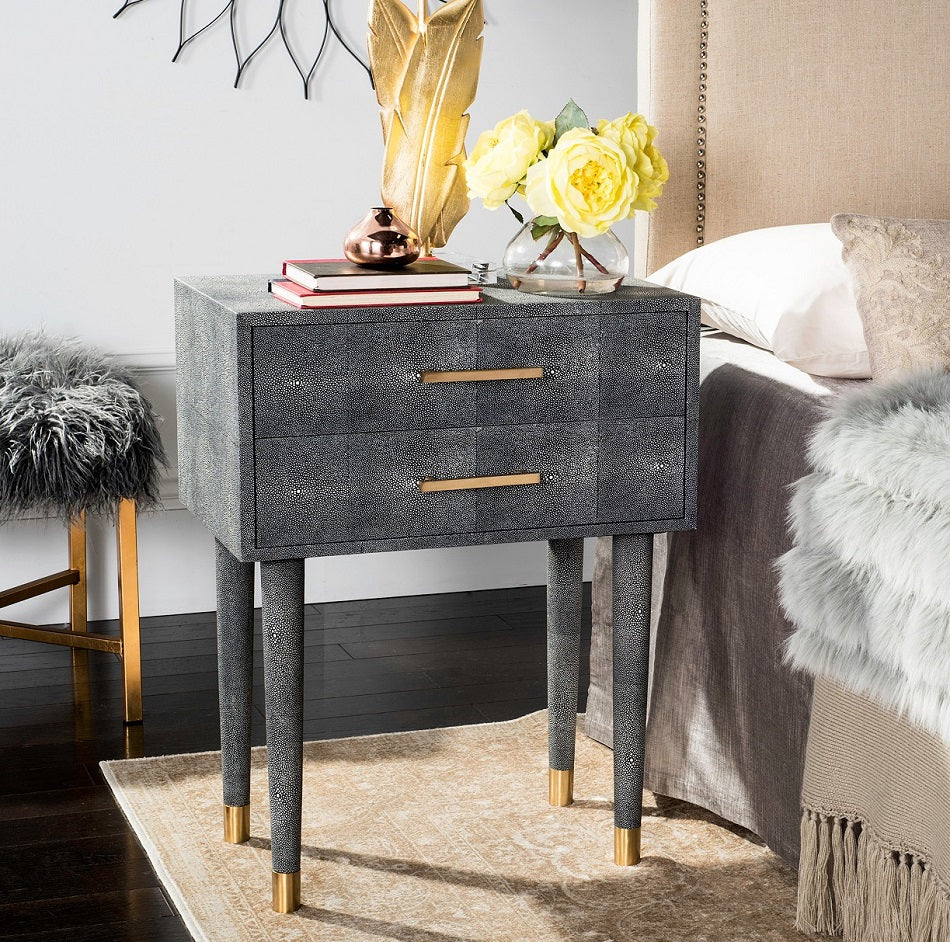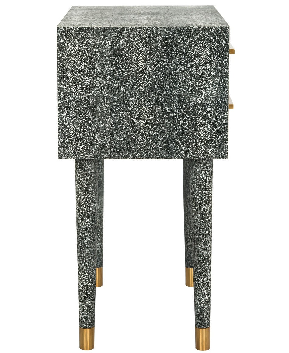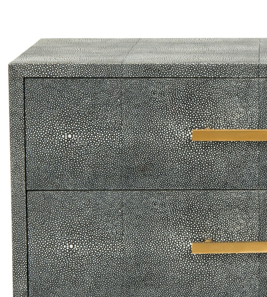 Inspired by the artistry of master cabinetmakers, the black Nour Shagreen End Table expertly balances the beauty of linear geometry and the craft of tactile composition. Its decadent capped brass legs and hardware make it a favorite of interior designers.