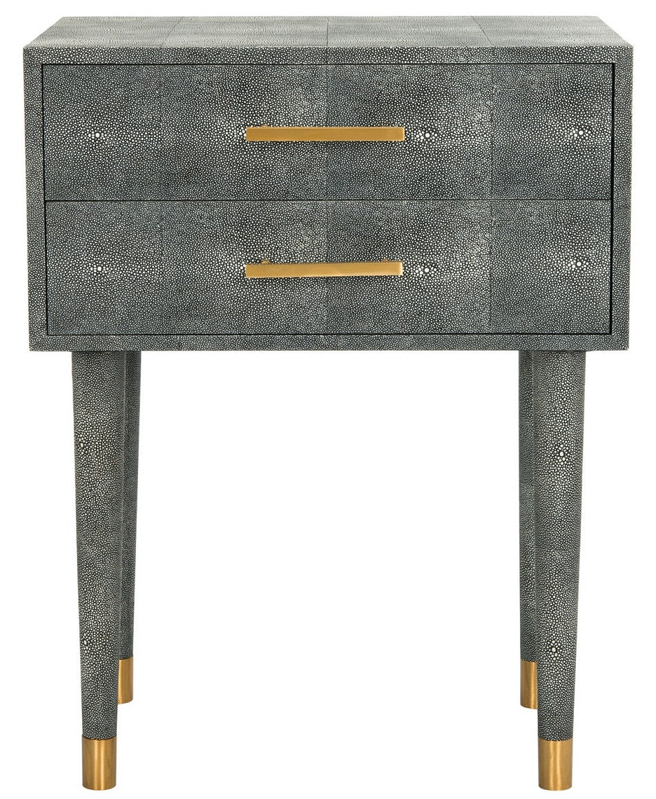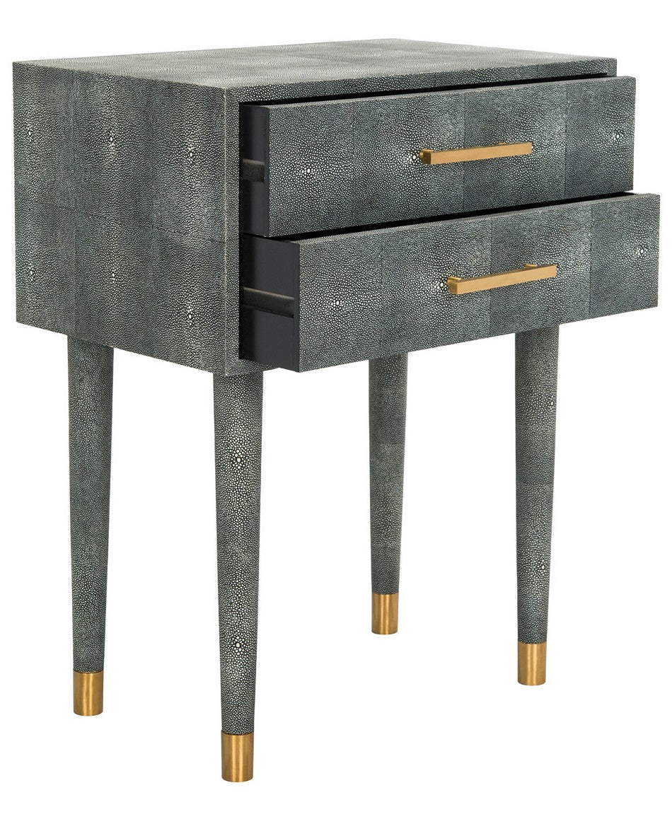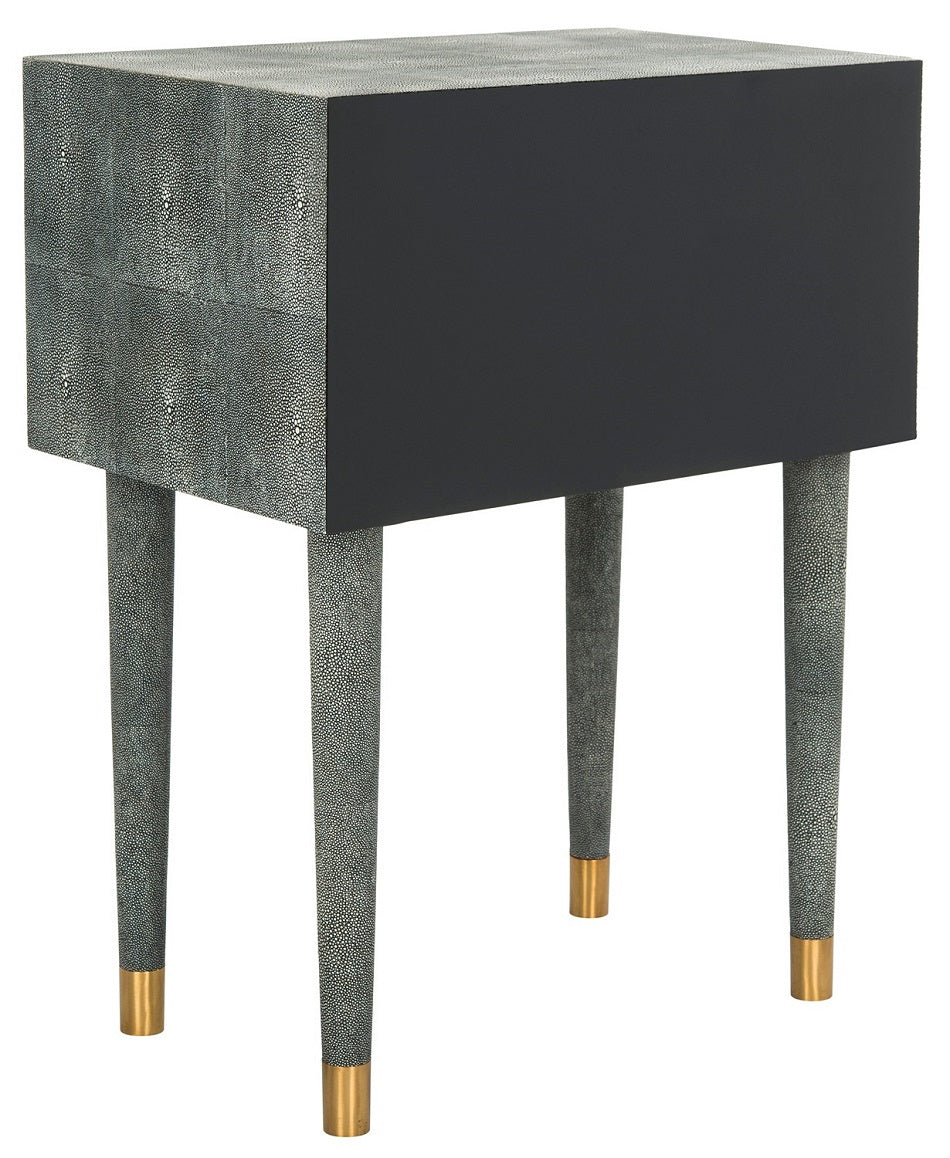 Inspired by the artistry of master cabinetmakers, the black Nour Shagreen End Table expertly balances the beauty of linear geometry and the craft of tactile composition. Its decadent capped brass legs and hardware make it a favorite of interior designers.