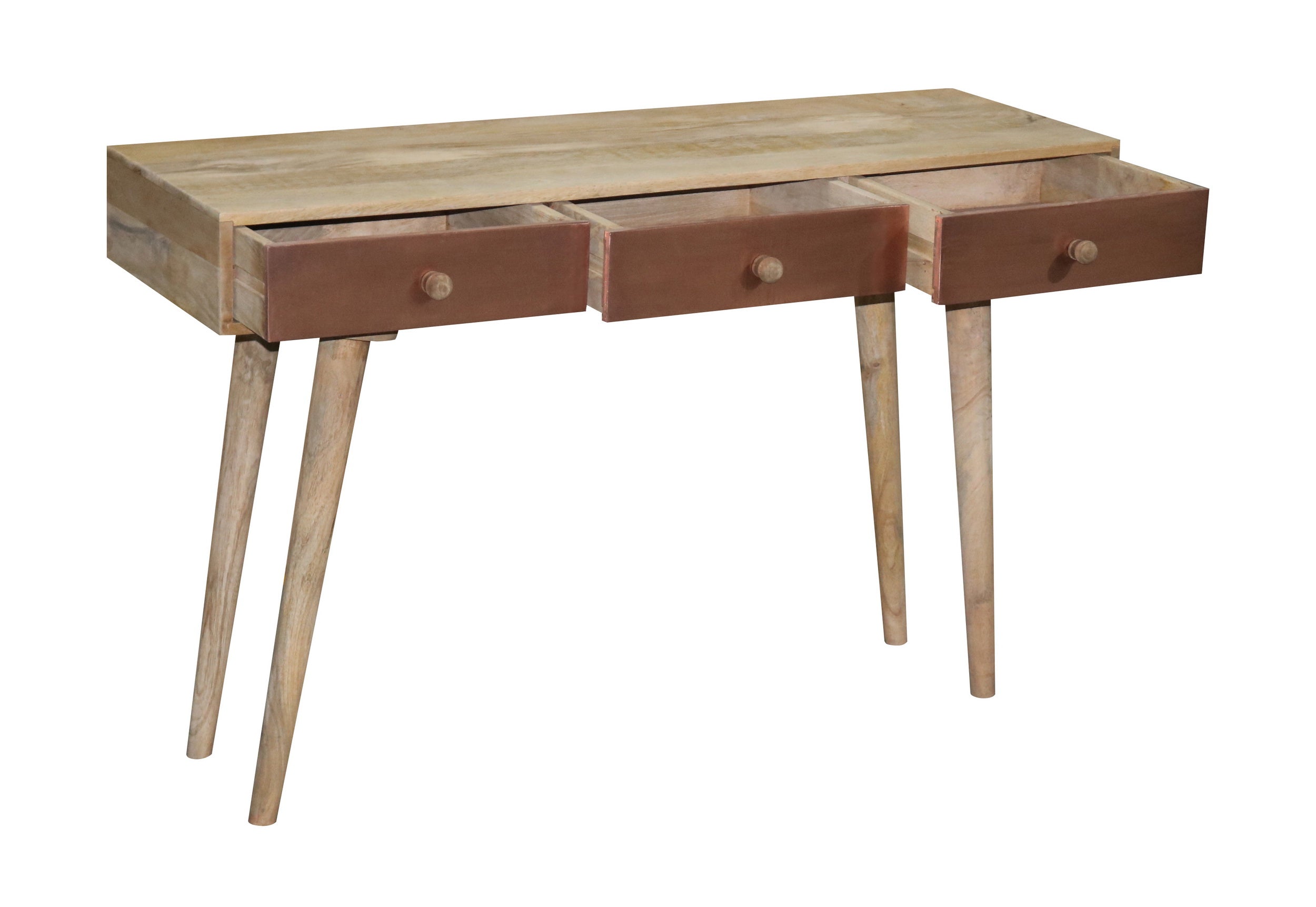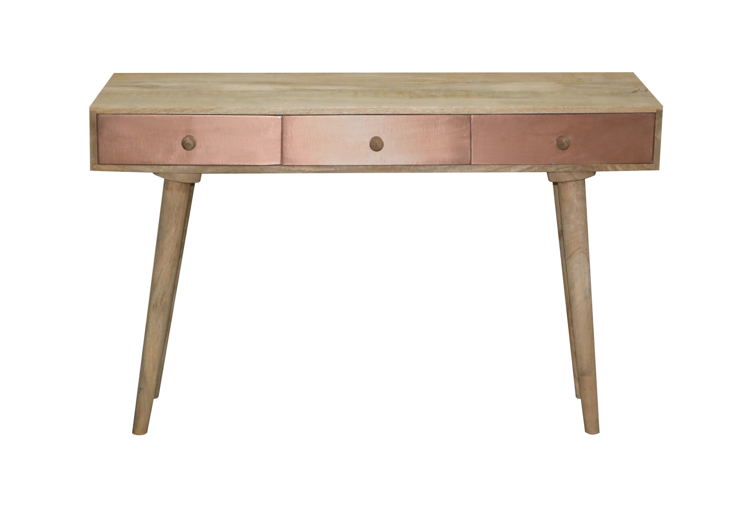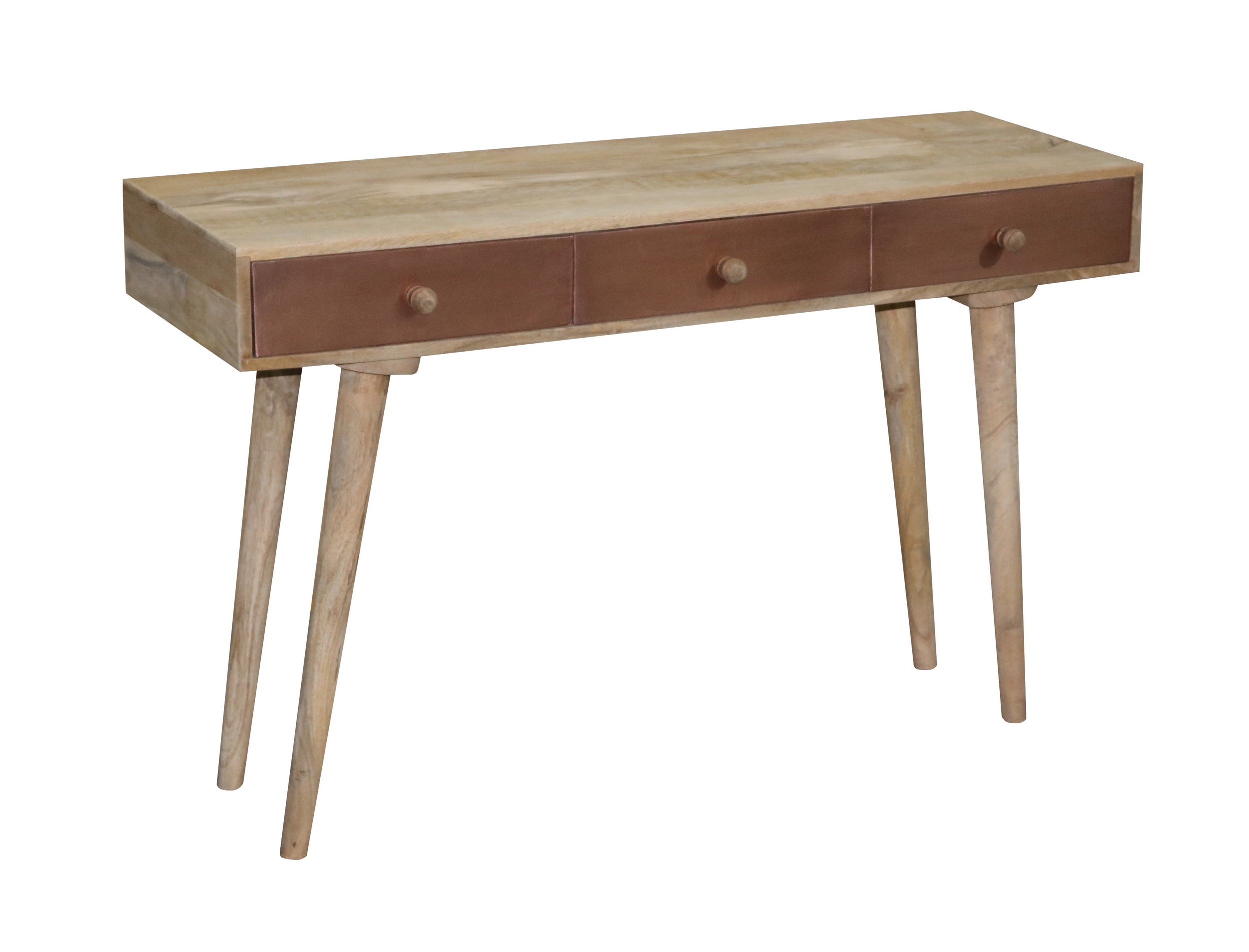 How fun is this? A great table for behind a sofa or just by itself. For those that want a little something different. A mid modern style design with 3 drawers for your hidden storage needs. Drawer fronts have actual copper applied to the face and wooden guides for opening. Wooden drawer knobs are the perfect simplistic touch to this great look.
