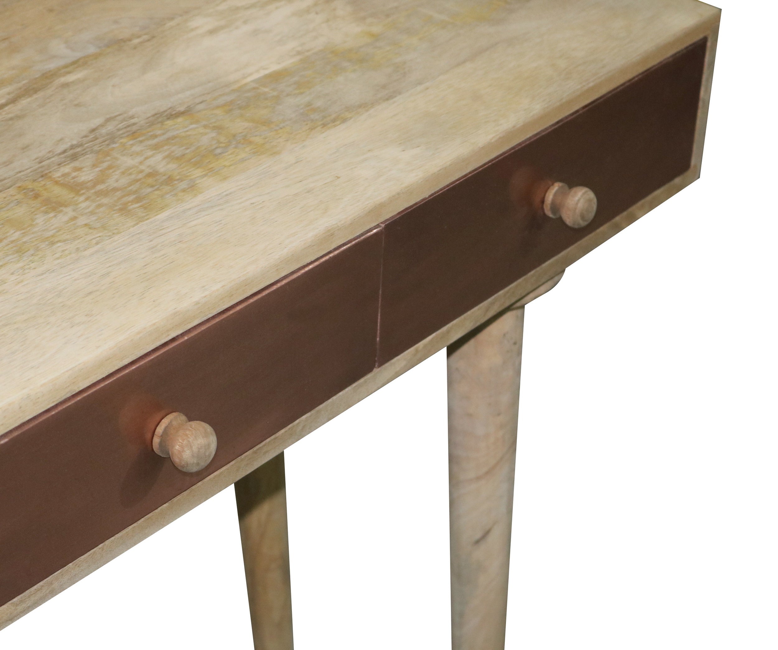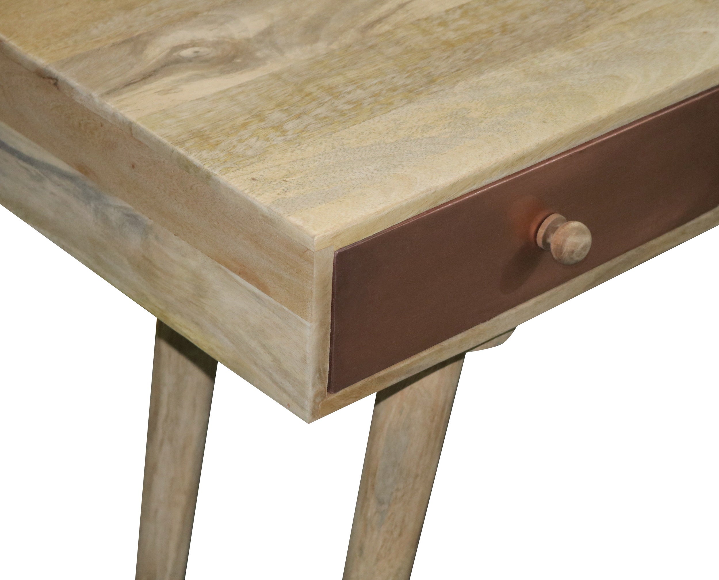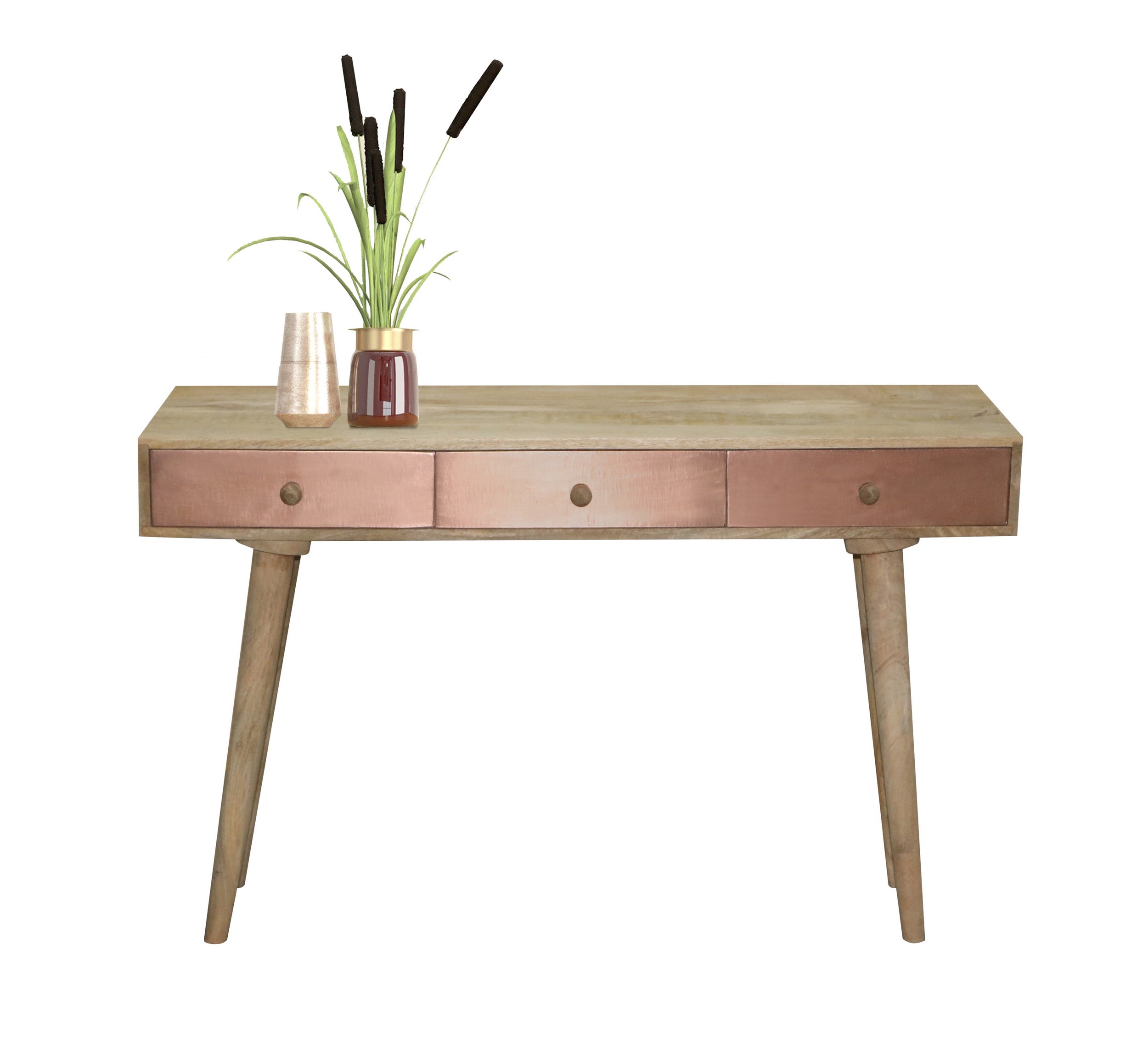 How fun is this? A great table for behind a sofa or just by itself. For those that want a little something different. A mid modern style design with 3 drawers for your hidden storage needs. Drawer fronts have actual copper applied to the face and wooden guides for opening. Wooden drawer knobs are the perfect simplistic touch to this great look.