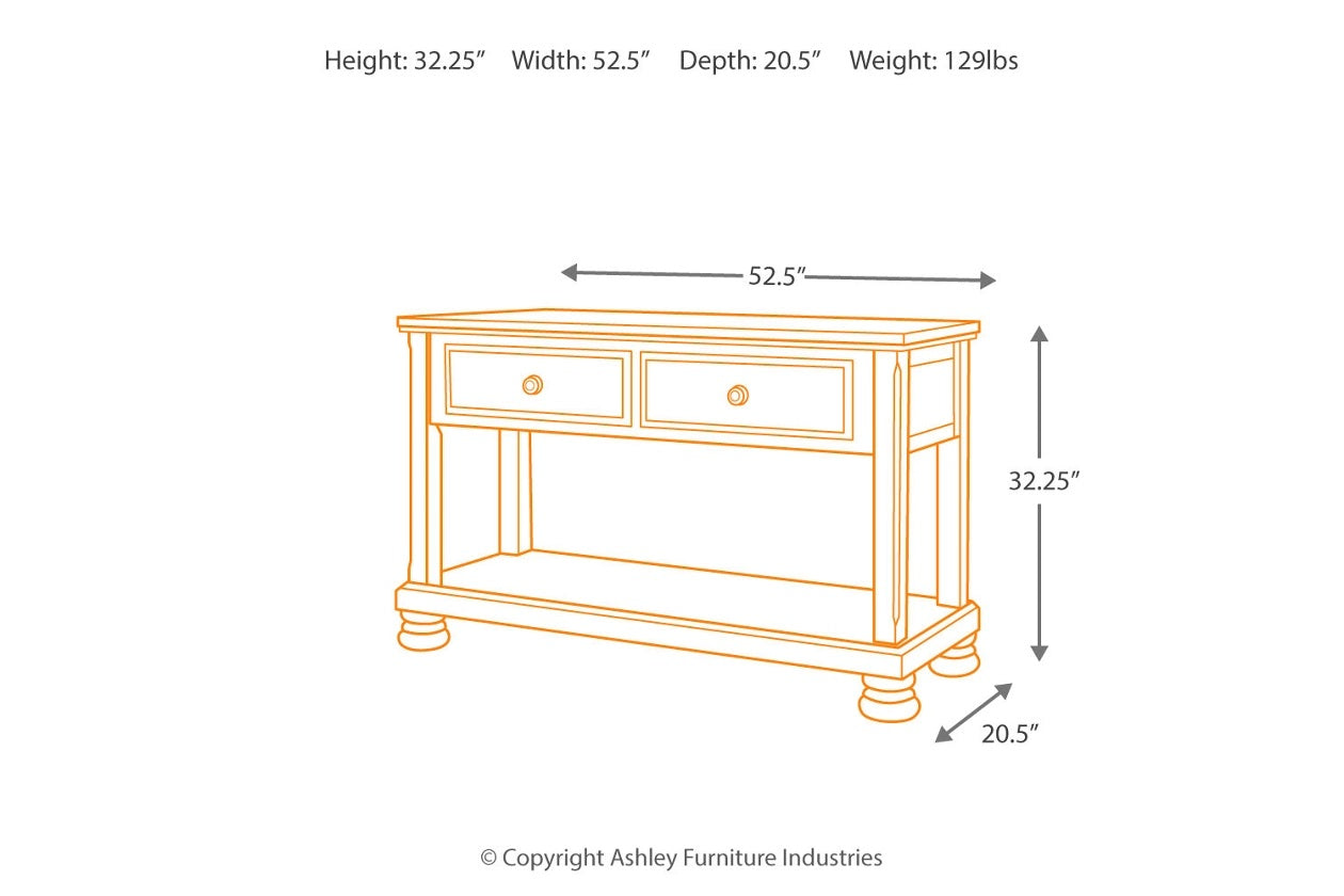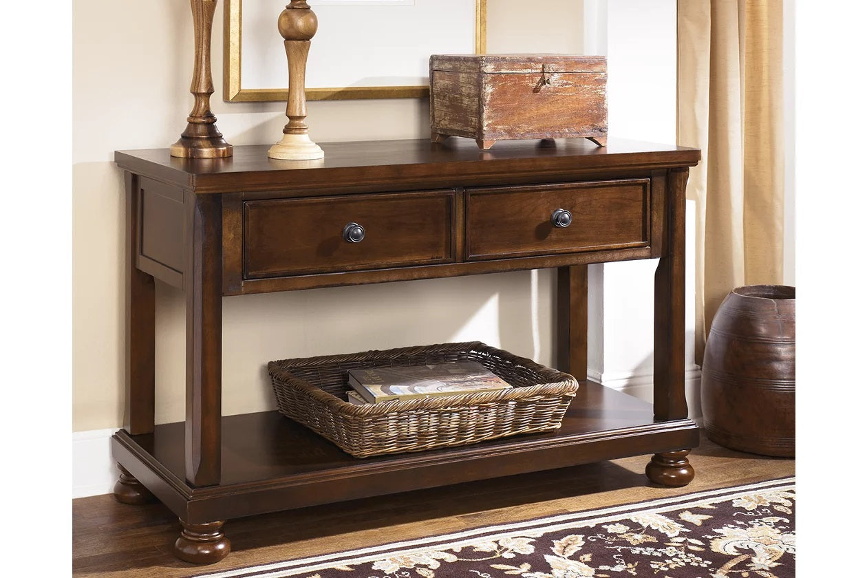 Add that finishing touch of traditional style to your space with the Porter sofa table. A burnished finish and classic bun feet exude a sense of relaxed elegance. Dual drawers and a bottom shelf give you the option of hiding things away or showing things off.