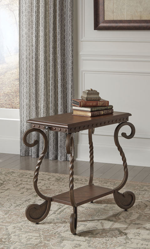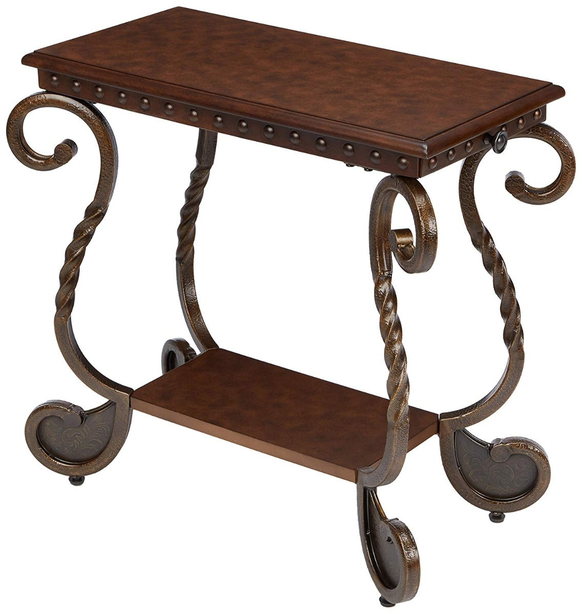 A twisted tale of beauty is perfectly embodied by the Rafferty chairside end table. Bathed in an earthy, rustic finish it’s got a nailhead-accent trim for a punch of character. Rugged elements are beautifully softened by scrolled serpentine legs in an antiqued hue for a sense of refinement.