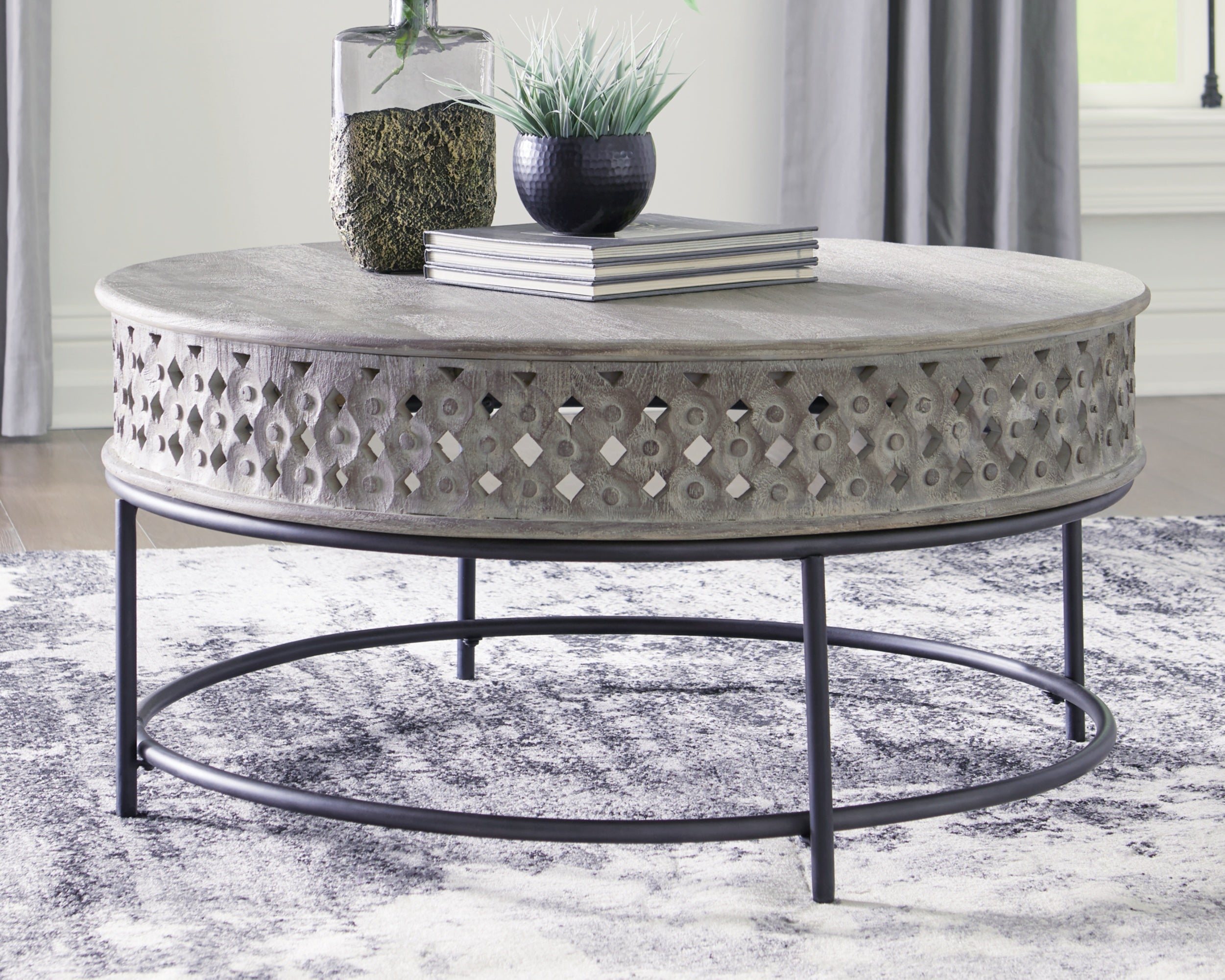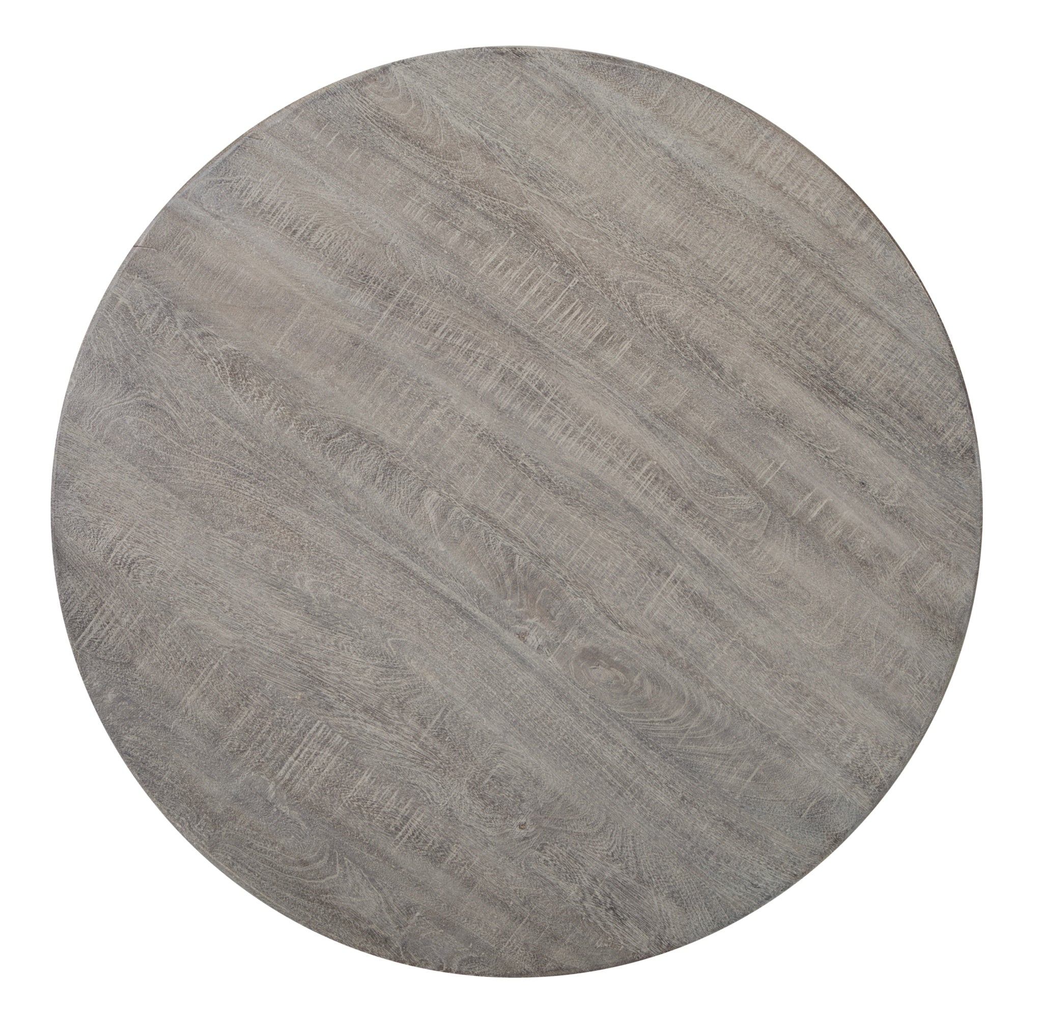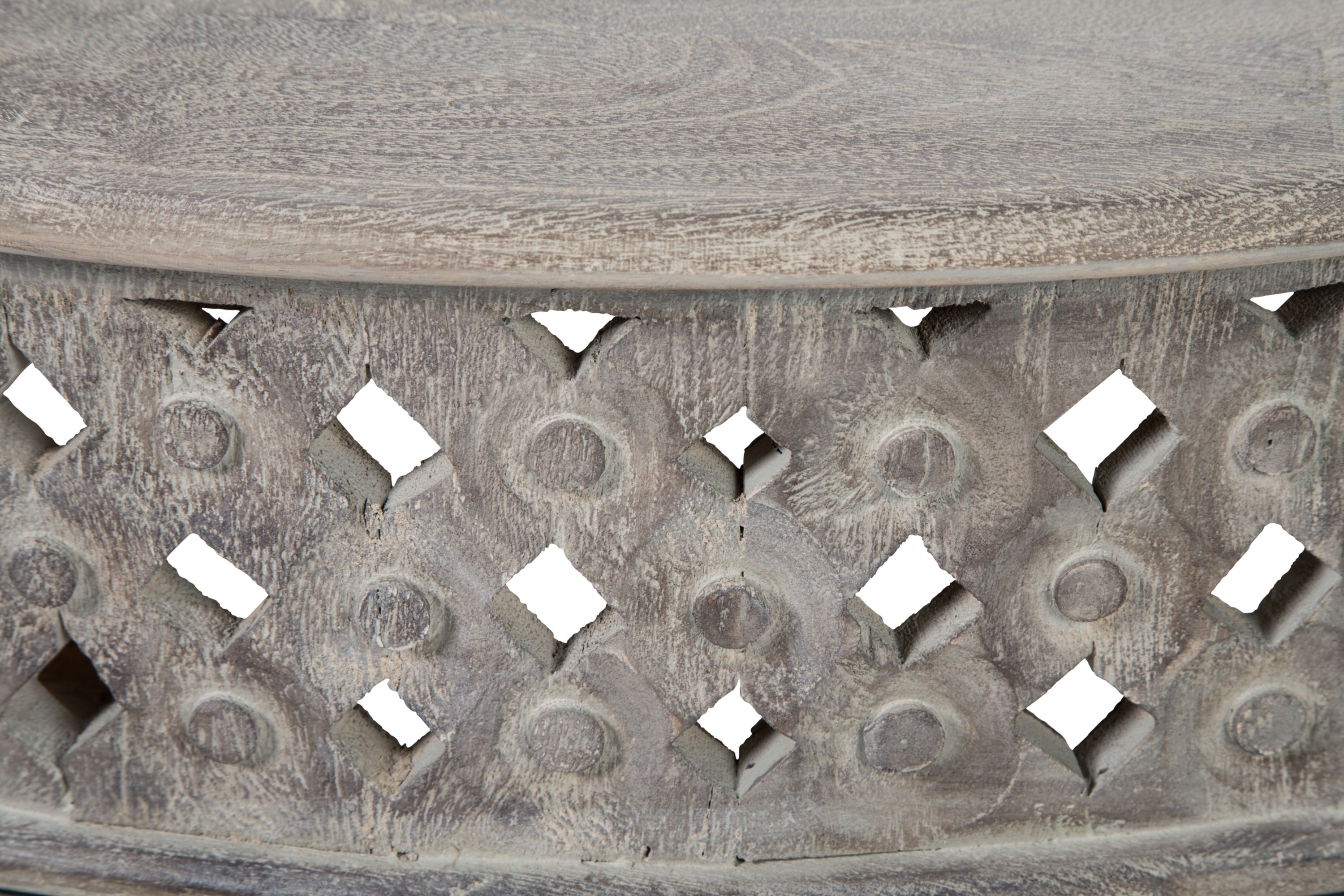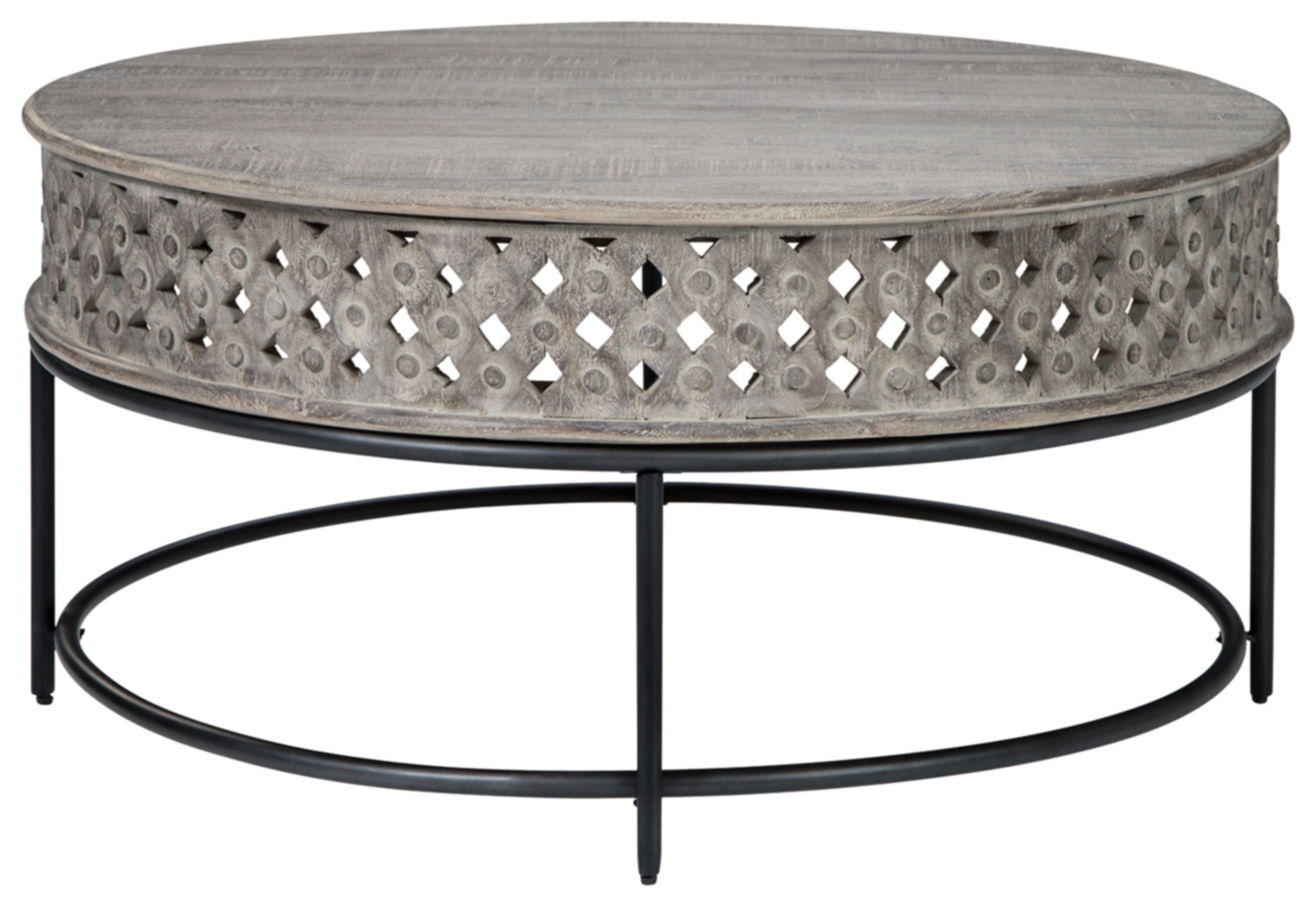The Rastella round coffee table is reserved for those carving out a cool, eclectic aesthetic. Elements of this distinctive table crafted with India mango wood include hand-carved aprons forming an open lattice weave. Metal frame in matte black is a striking complement to the tabletop’s burnished gray finish.