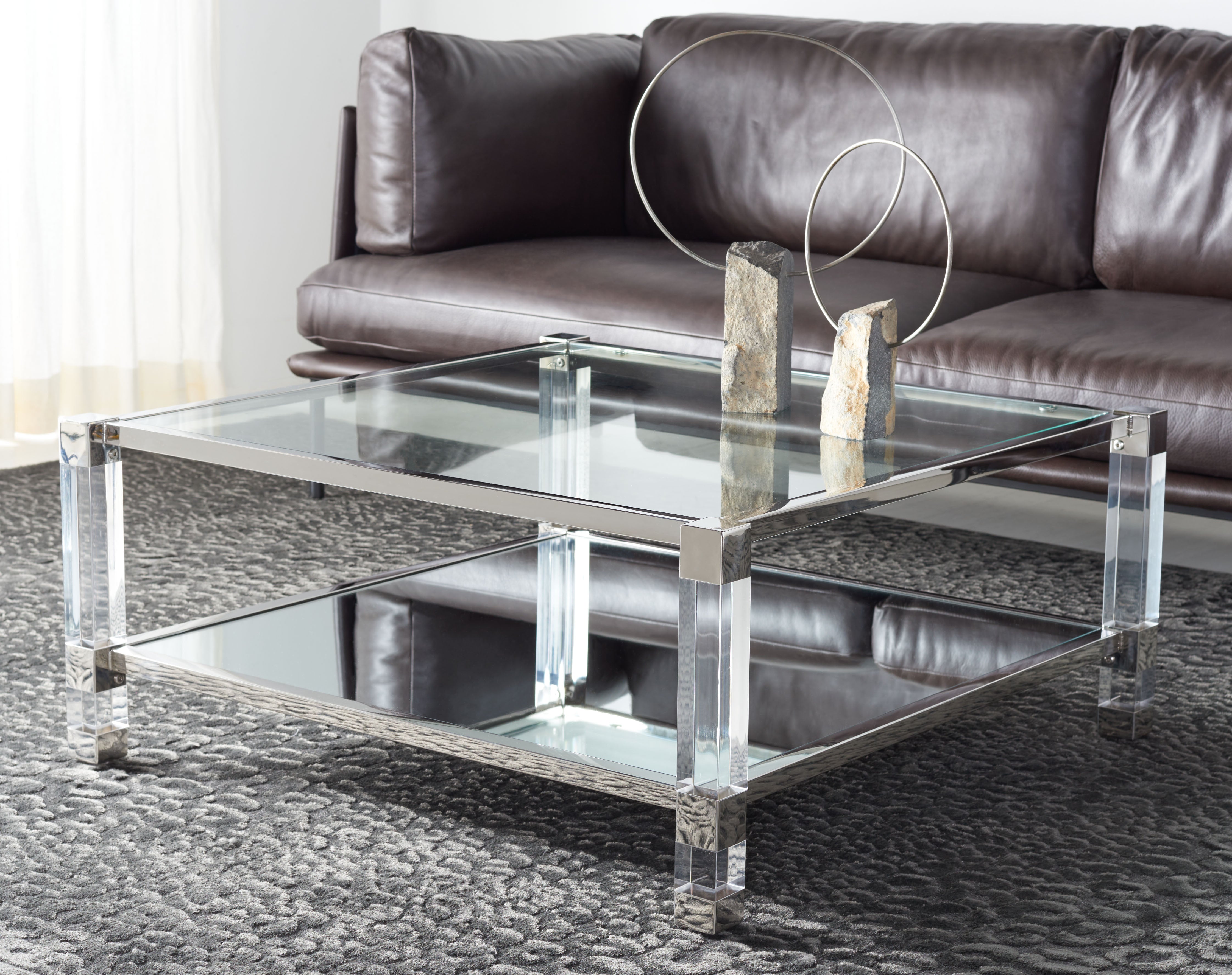 Bringing uncanny charisma to any room, this Raveena Coffee Table takes inspiration from Old Hollywood glamour. Raveena’s glass, acrylic, and mirrored details conjure the lavish decadence of the silver screen, while silver stainless steel accents showcase its captivating charm.
