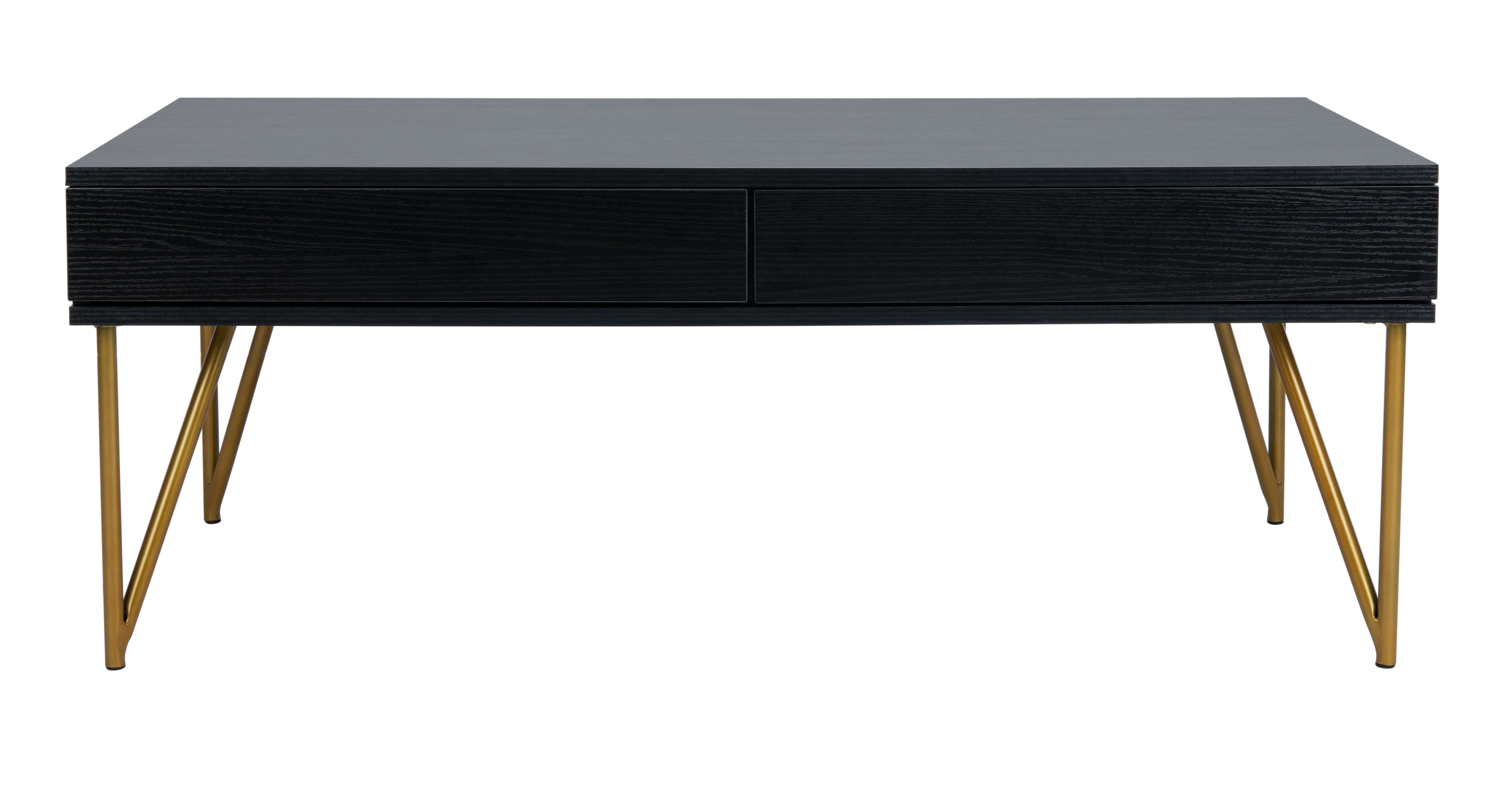 Refresh and renew any living room with the retro style of this Pine Two Drawer Coffee Table. Warm and inviting, its black wood craftsmanship highlights the clean lines of its generous storage, while its lustrous gold finish on hairpin legs gives it a modern spin.