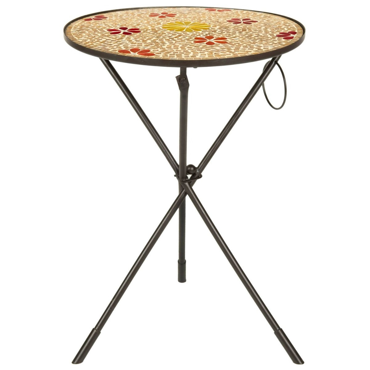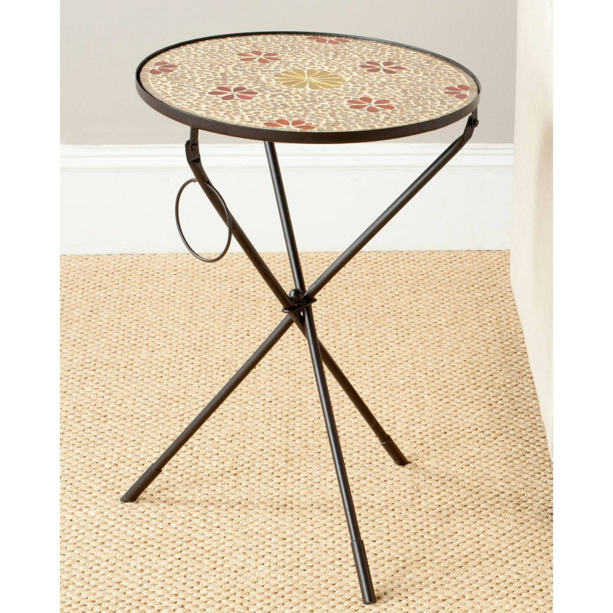 Poetic yet practical, the Cymbeline Side Table brightens up even the smallest spaces. Crafted with a rust and gold glass floral mosaic top with graceful iron tripod legs, this artistic piece is amazing beside a sofa or chair and equally attractive in a bedroom or bath.