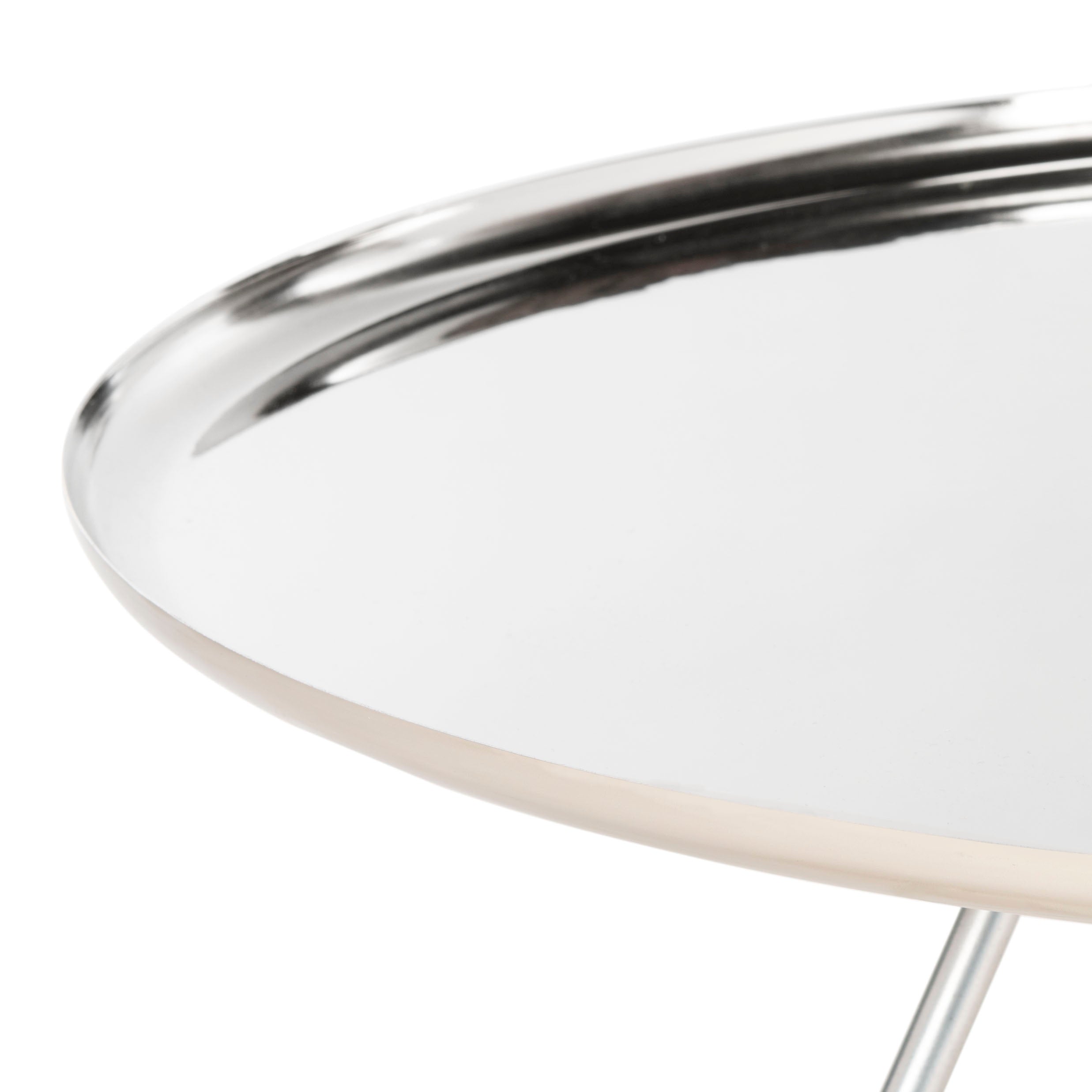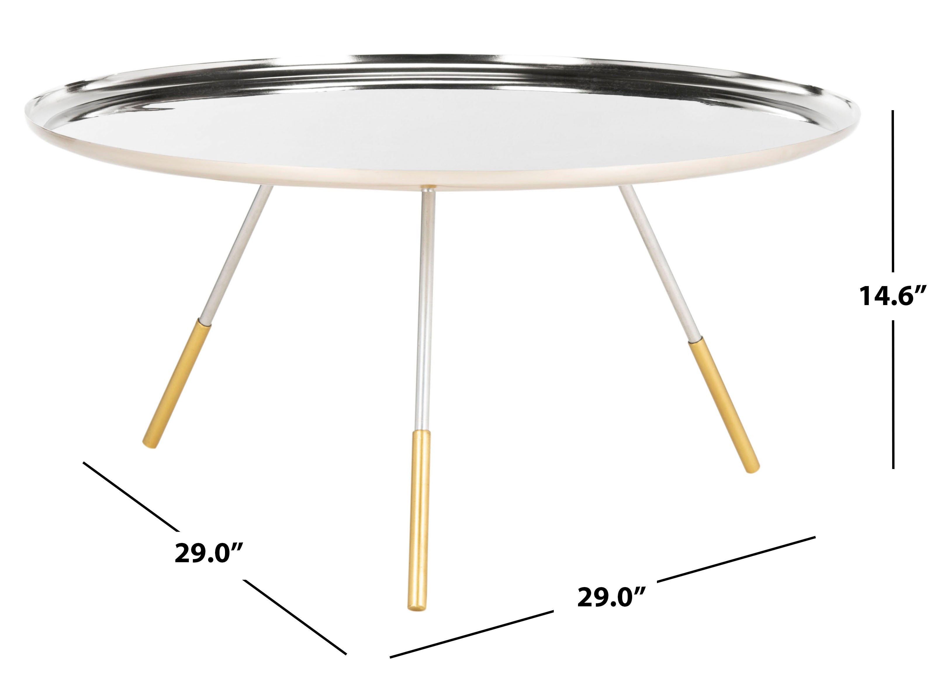 Ideal for daily gatherings, this contemporary coffee table blends form and function. Finished in a versatile silver hue, its large circular tray style top is perfect for drinks and snacks. Chic metal gold cap legs add a touch of luxury.