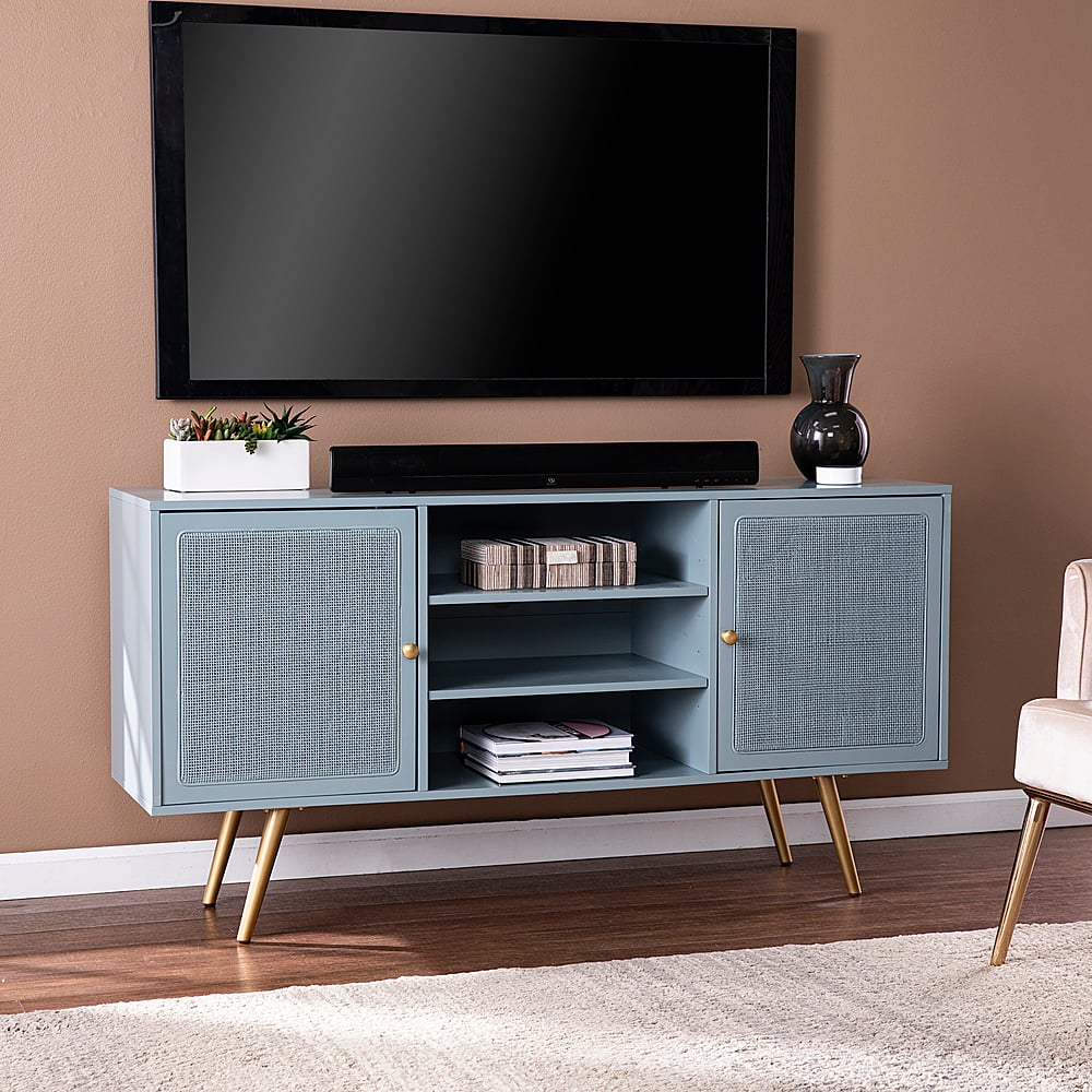 Bring home a retro feel with this low-profile media cabinet. Spacious cabinets organize everything from movies and books to toys and pet gear, while natural rattan accents add unique texture to your space. Adjustable media shelves hold game consoles and receivers, keeping all your media necessities tidy and accessible. Kick back and relax with your favorite movie when you add this TV stand with storage to your living room or open concept space.