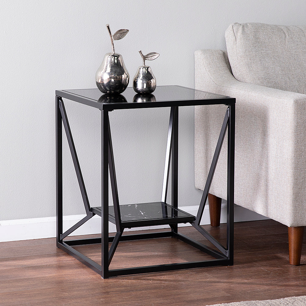 Display storage comes home with this glass-top side table. A faux marble shelf provides space for modern décor pieces while the black glass tabletop holds a reading lamp or your cup of coffee. Designed for small spaces this sleek end table slide neatly alongside your sofa or between a pair of armchairs. Elevate your contemporary décor when you add this square accent table to your living room or open concept space.