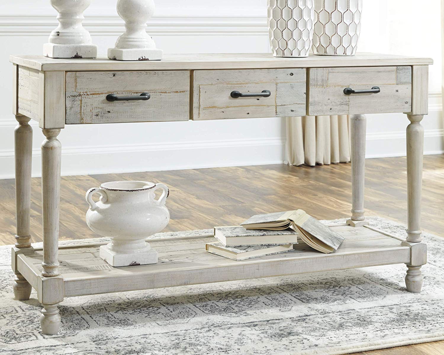 With its distinctive whitewash finish, plank-effect styling and distressed touches that lend a reclaimed sensibility, this sofa table serves up a delightful twist on farmhouse style. Crafted with solid pine wood, this sofa table sports three storage drawers and underlying shelf for that much more character.