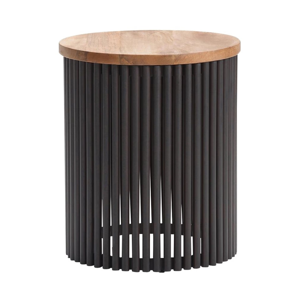 This accent table features open metal pipe work on the base with a solid wood top. The on-trend matte and natural wood finish will compliment your decor. A unique accent piece to highlight your living room, entryway or bedroom.