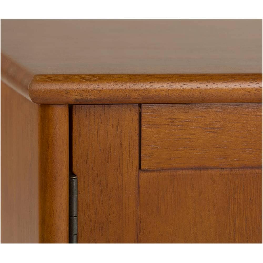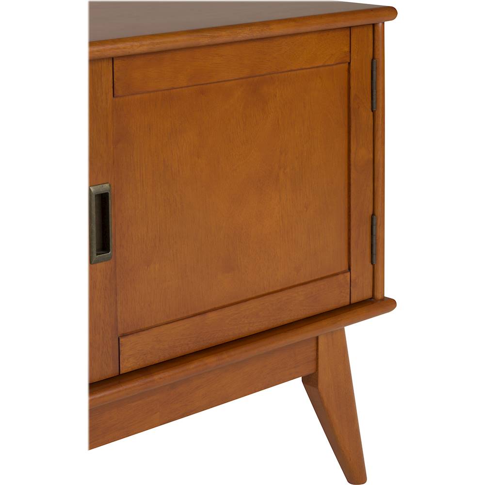 Store and display your multimedia equipment with this mid-century modern Simpli Home Draper TV stand. The 26-inch-high stand holds up to a 66-inch television on top, and the combination of two open cubbies and two closed cabinets simplifies device and disk organization. This handcrafted teak brown Simpli Home Draper TV stand is made from solid rubberwood for durability.