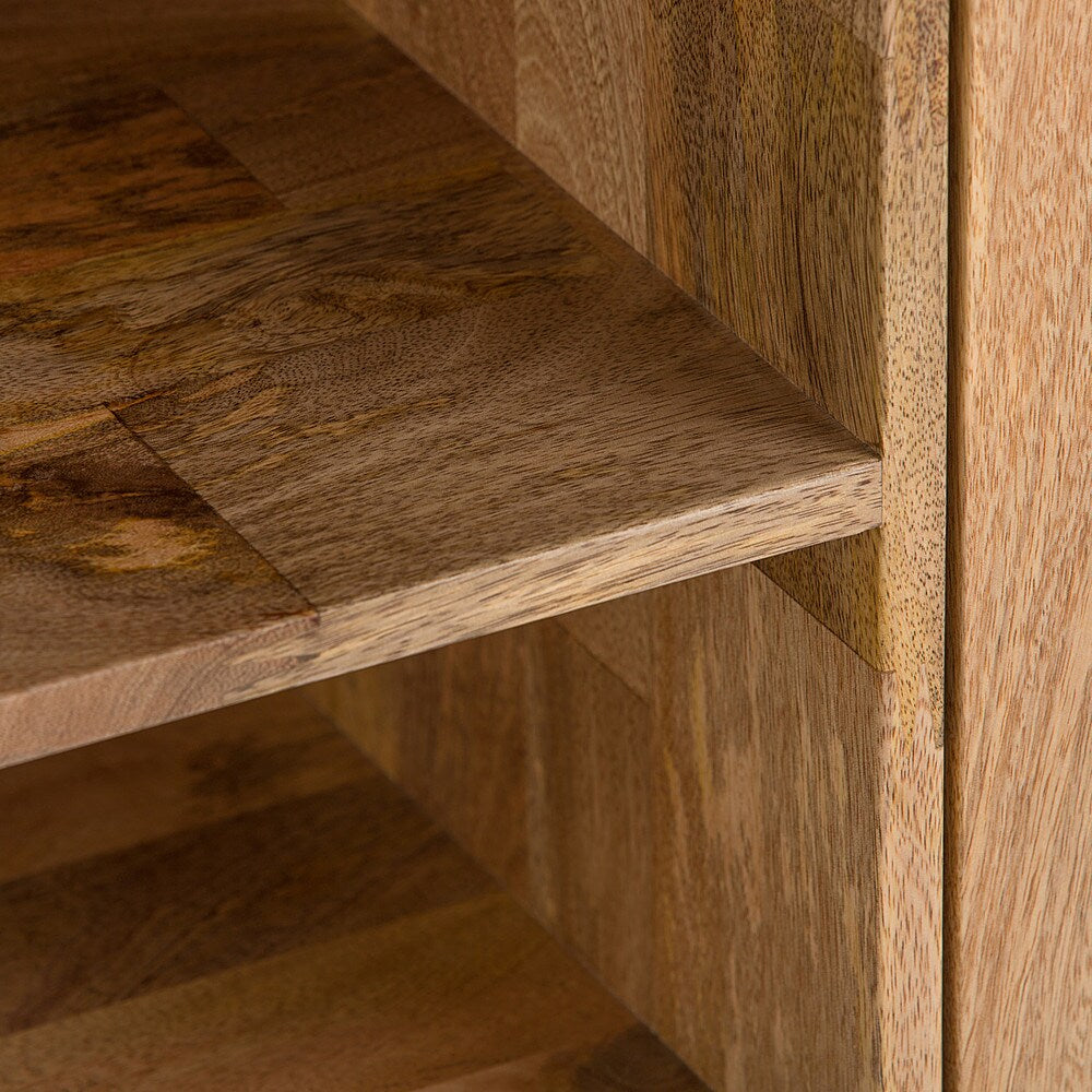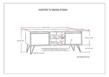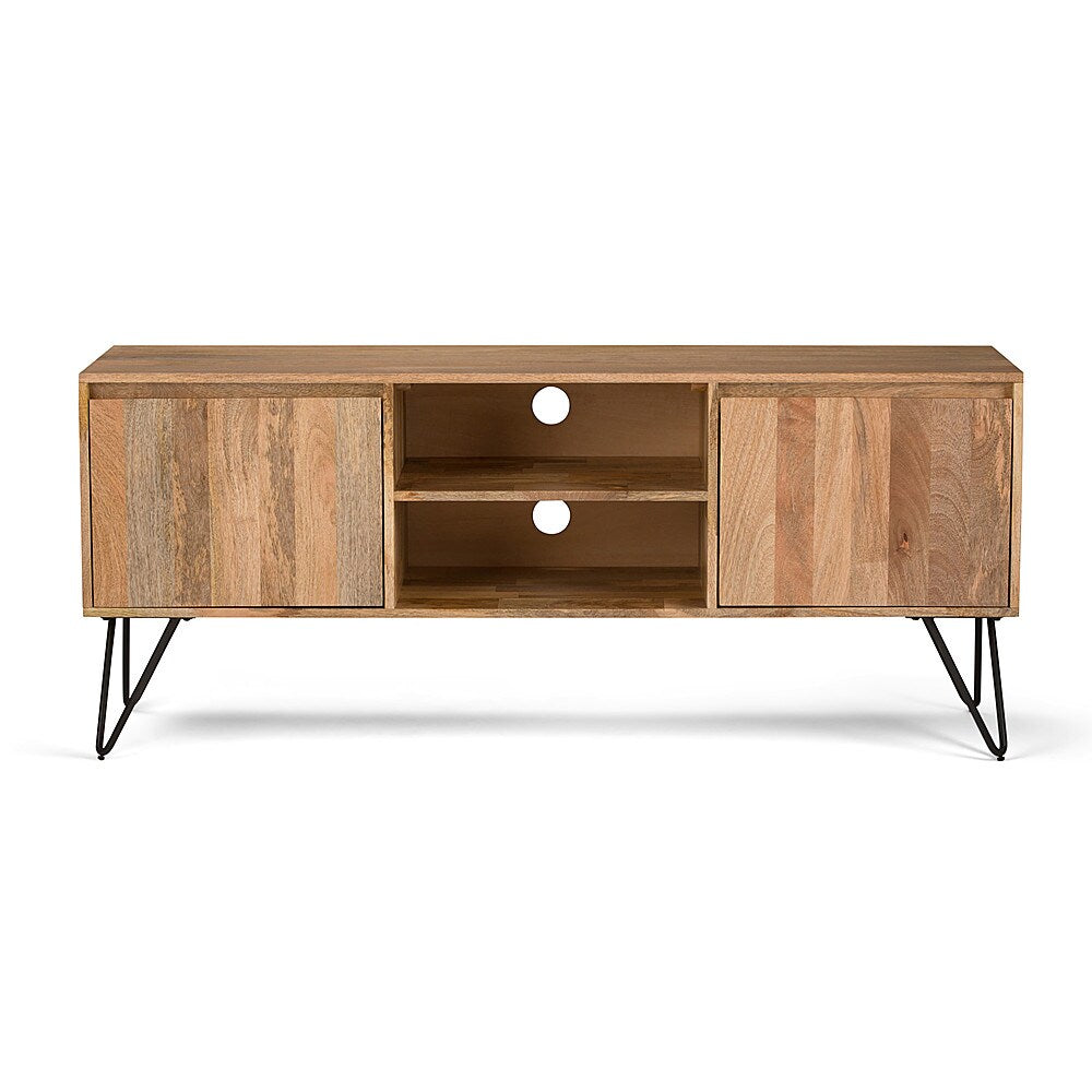 Clean-lined design meets industrial chic with the Hunter TV Media Stand. Hand-crafted with a combination of solid Mango wood and sturdy metal hairpin legs. The open shelving and hidden storage compartments make it easy to stay organized and wire-free. Ideal for storing DVD favorites and media accessories. Perfect for TV's up to 66 inches, this media unit brings function and style to any den or living room.