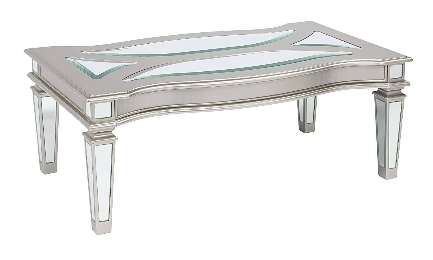 With glitz and glam worthy of a queen, the Tessani coffee table is ravishing. Unique curved shaping on the table top is adorned with mirrored beveled glass insets. Apron panels marry in alluring mirrored legs. With its silver sheen finish, this table will make you feel like royalty.
