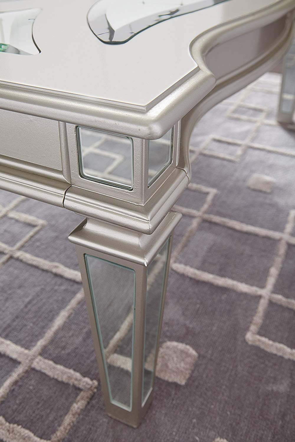Tables are made with MDF and hardwoods solids and finished in a metallic silver finish. Clean lines are accented with bevel mirror details.