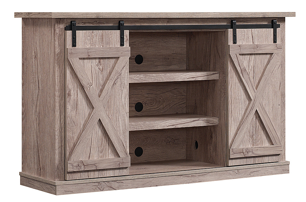Enjoy modern farmhouse charm with this TV stand for flat screen TVs up to 60 inches and 50 pounds. Its unique saw cut style and innovative sliding barn doors will help you create a look everyone will love. Those unique doors conceal two side cabinets each with two adjustable shelves for ample storage space. The open center shelf area also has two adjustable shelves making more than enough room for gaming consoles media components and accent pieces you love to show off. Back panel cutouts help control wire tangles and provide ventilation for cooling components.