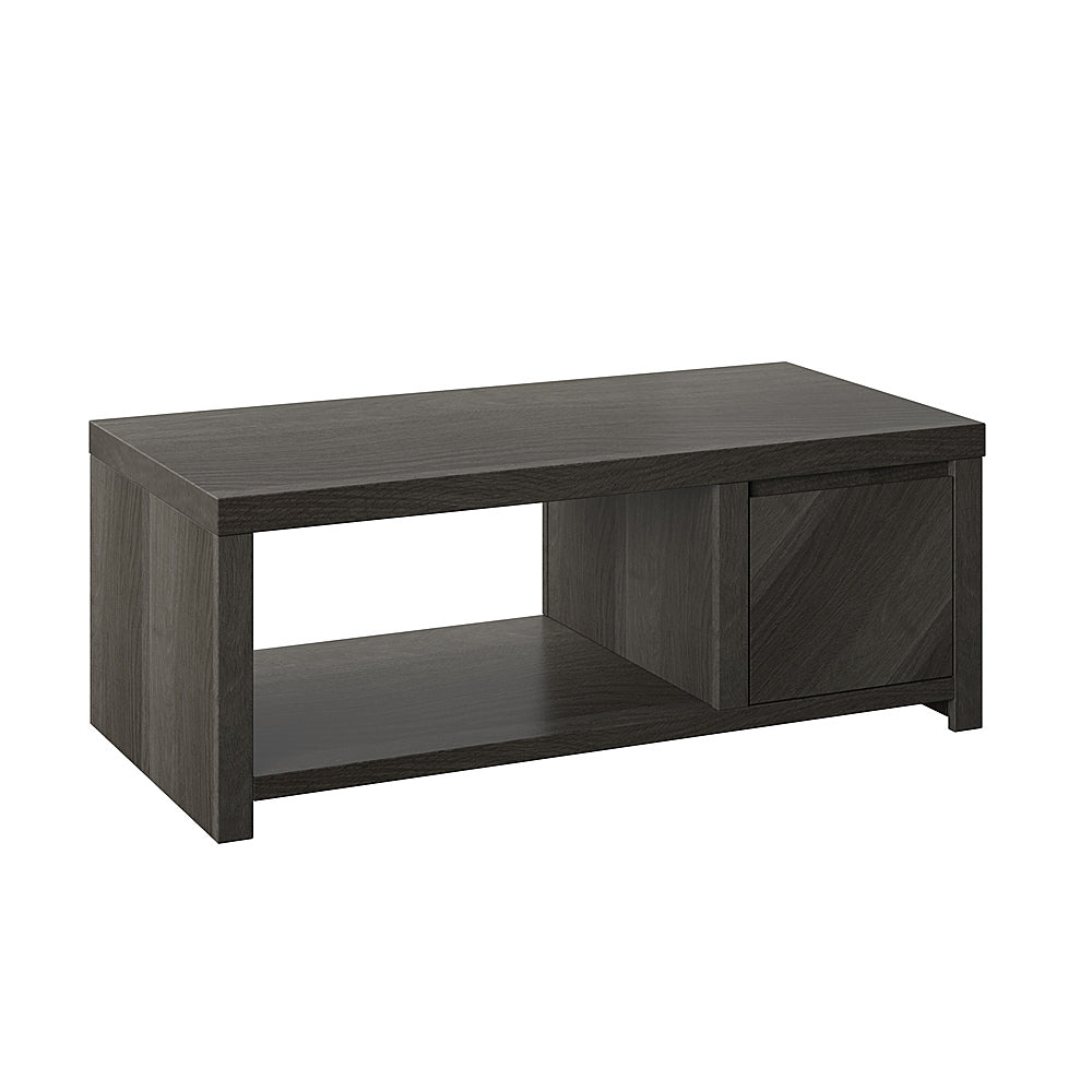 For a dramatic look that makes any room come alive the Morado Bay Coffee Table is the perfect addition to your home. The Fillmore Oak finish complements the striking asymmetrical design. The larger side features a lower shelf open on two sides while the smaller side includes a cabinet with adjustable shelf concealed by a door with a sweeping diagonal grain pattern. This piece is finished on four sides for versatile placement in any room. See the rest of the collection with the Morado Bay Side Table and the Morado Bay Bluetooth® Compatible TV Stand with ClassicFlame® Electric Fireplace.