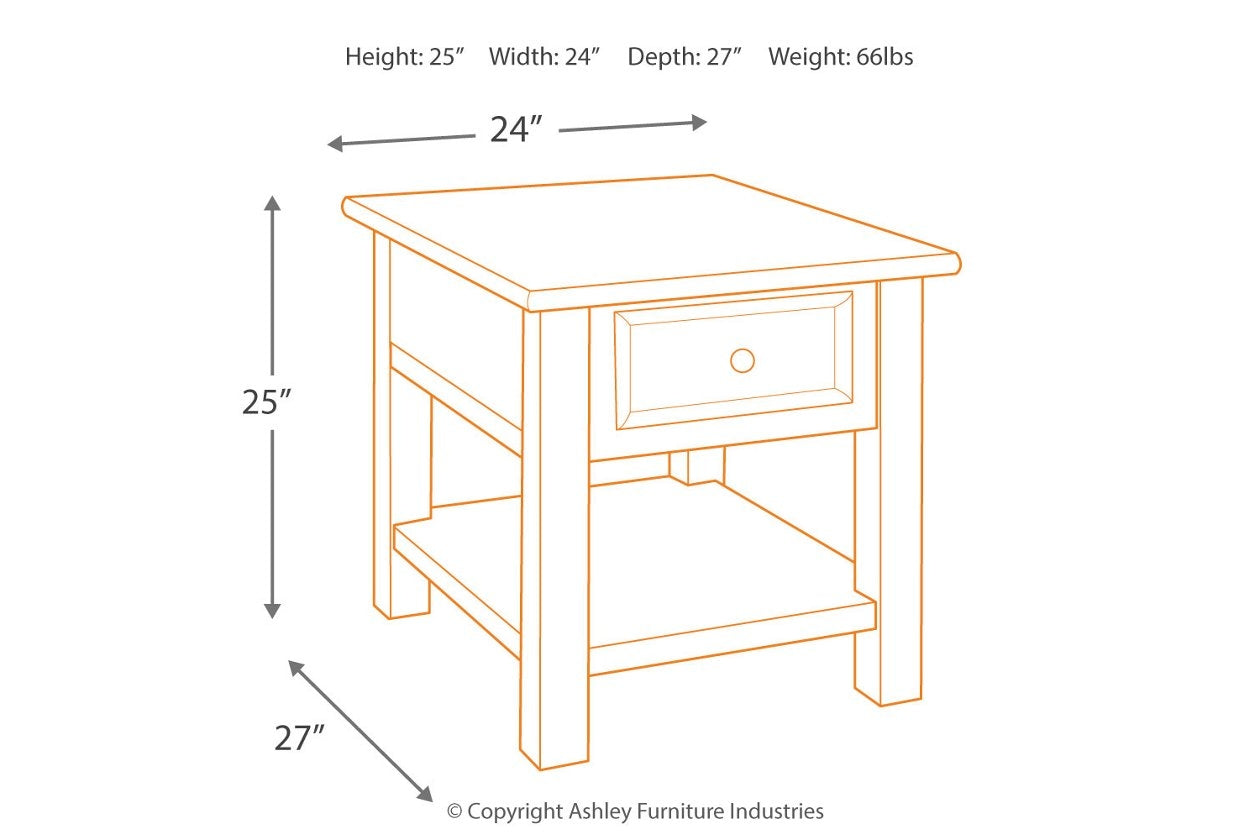 Shabby chic with a hint of down home country. This rectangular end table with textured black finish is all the talk of today's design world. Wood grain shows through the weathered gray-brown top in all of its earthy pleasure. Framed drawer is adorned with lovely traditional hardware. Smooth pull-out makes it easy for you to store away your belongings in style.