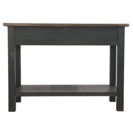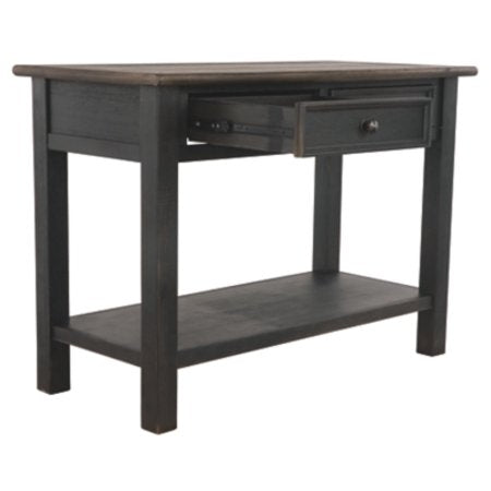 Shabby chic with a hint of down home country. This sofa table with textured black finish is all the talk of today's design world. Wood grain shows through the weathered gray-brown top in all of its earthy pleasure. Framed drawers are adorned with lovely traditional hardware. Smooth pull-out makes it easy for you to store away your belongings in style.