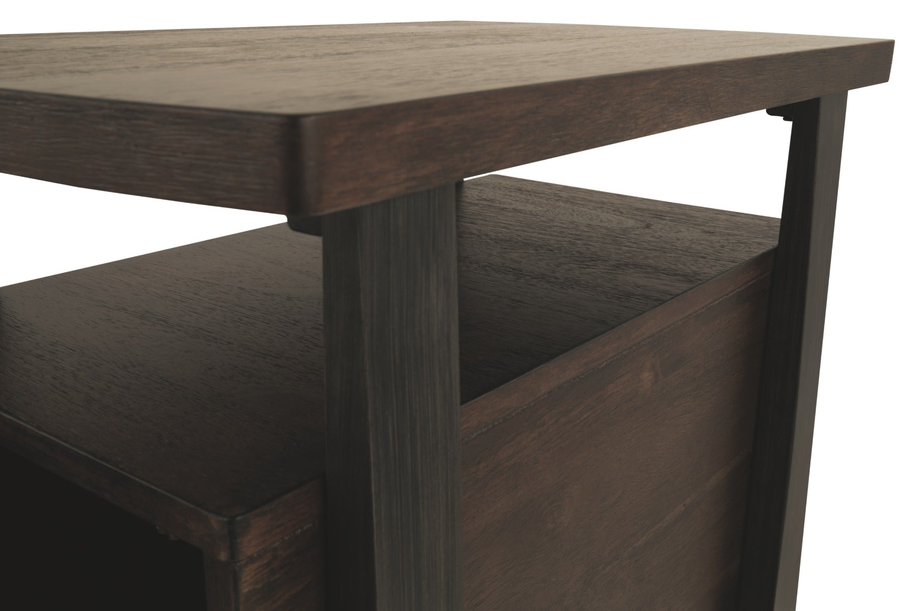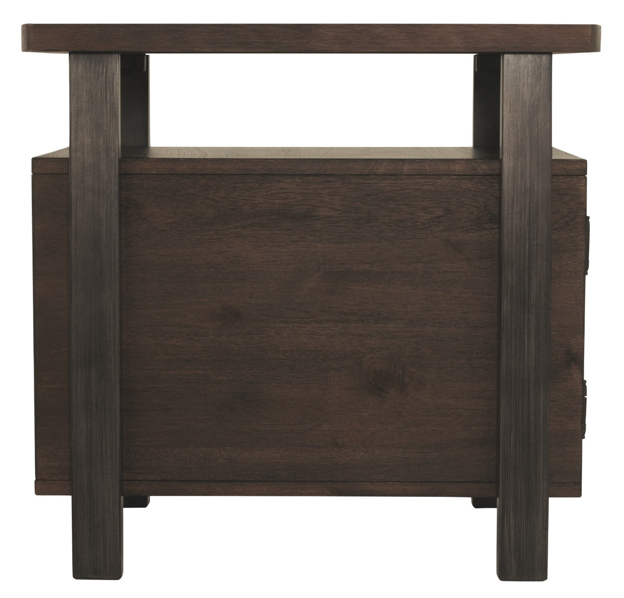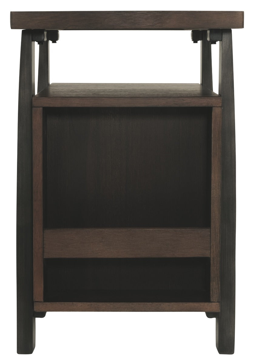 Form, function and a whole lot of style is what this chairside end table is all about. Its deep cabinet, open upper shelf and top offer lots of convenient spots to keep chairside necessities. The distressed brown finish contrasts beautifully with the dark brown faux metal finished legs for a floating top look that's striking. The magazine rack on the back of the table is an added bonus for keeping periodicals within reach, but out of sight—quite a value for a look that will withstand the test of time.