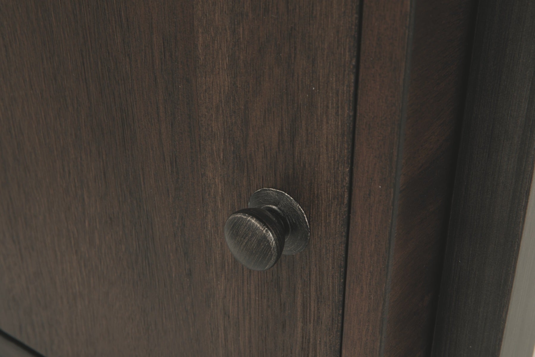 Grayish brown distressed finish with dark brown faux metal finished legs