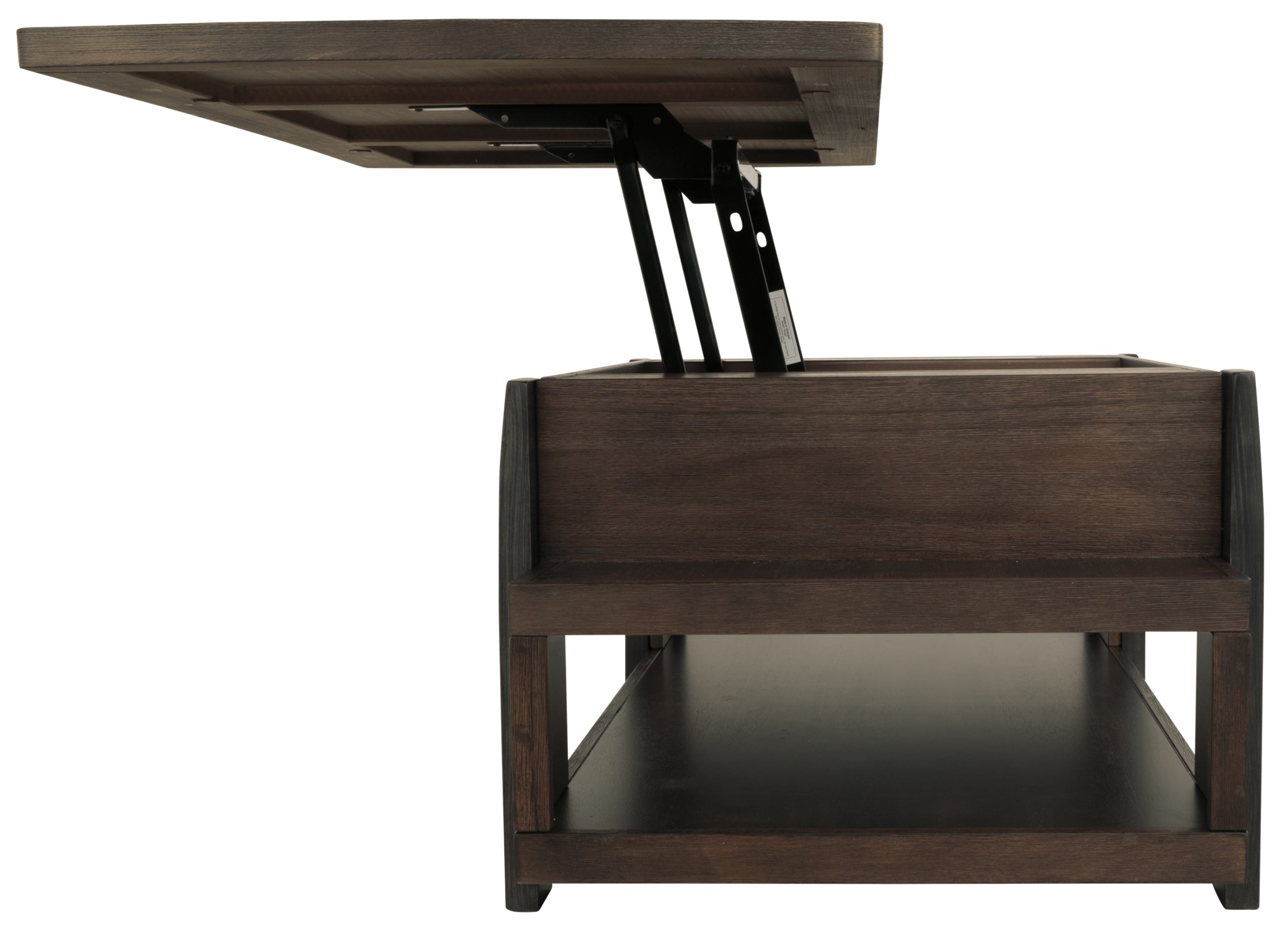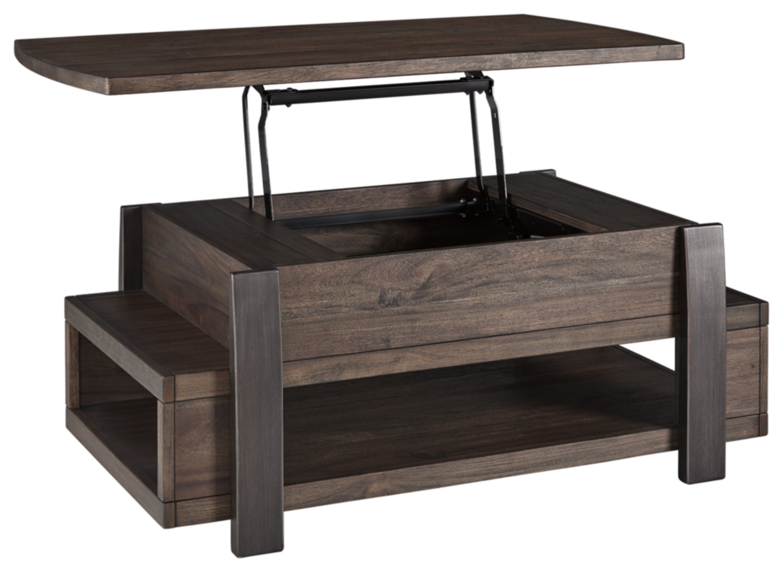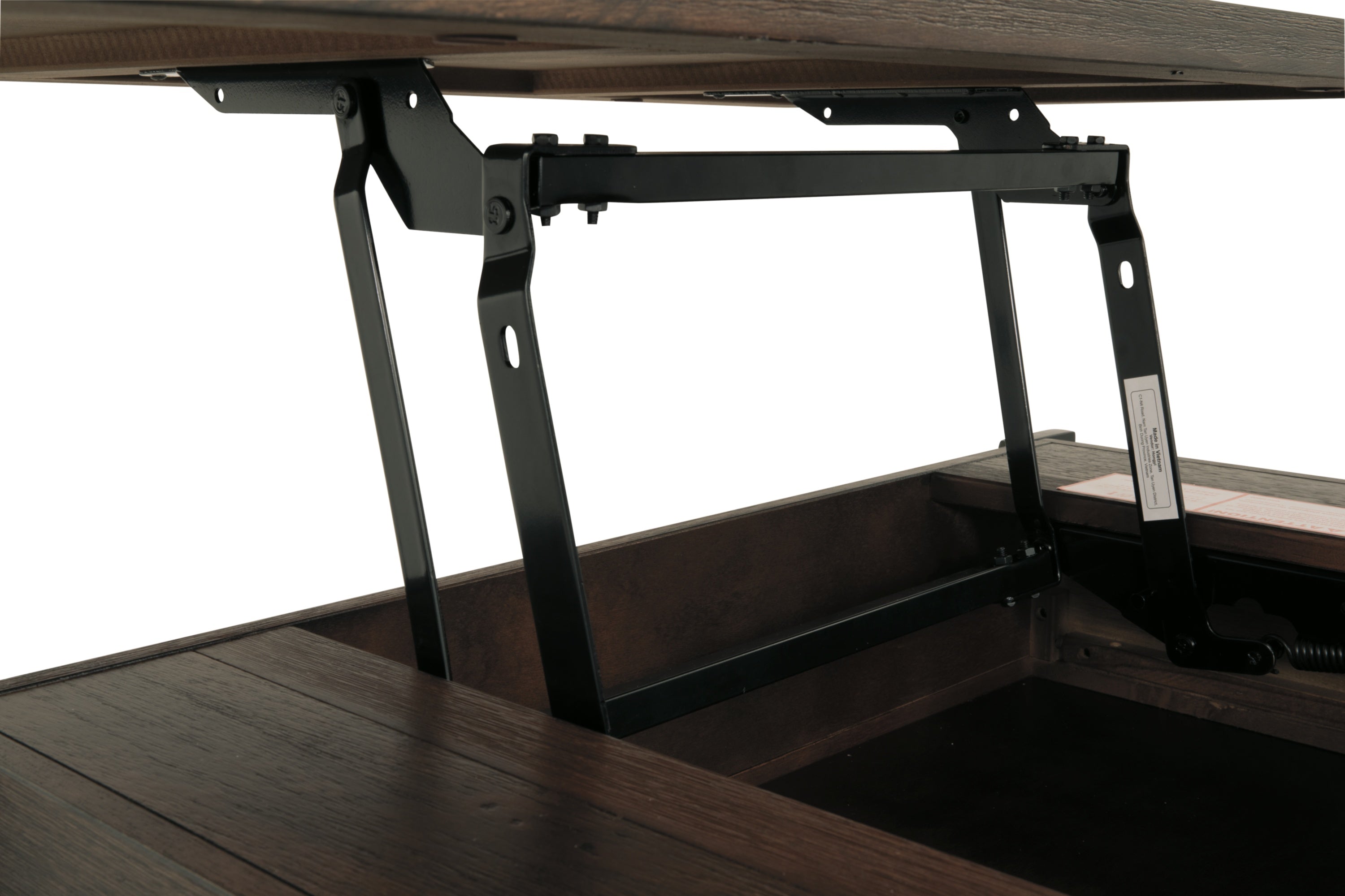 A table with form and function, and a whole lot of style, is what the Valibry lift top cocktail table is all about. Its handy lift top, open lower shelf and signature side shelves offer lots of convenient spots to keep the room's necessities. The distressed brown finish contrasts beautifully with the dark brown faux metal finished legs for a floating top look that's striking—quite a value for a style that will withstand the test of time.