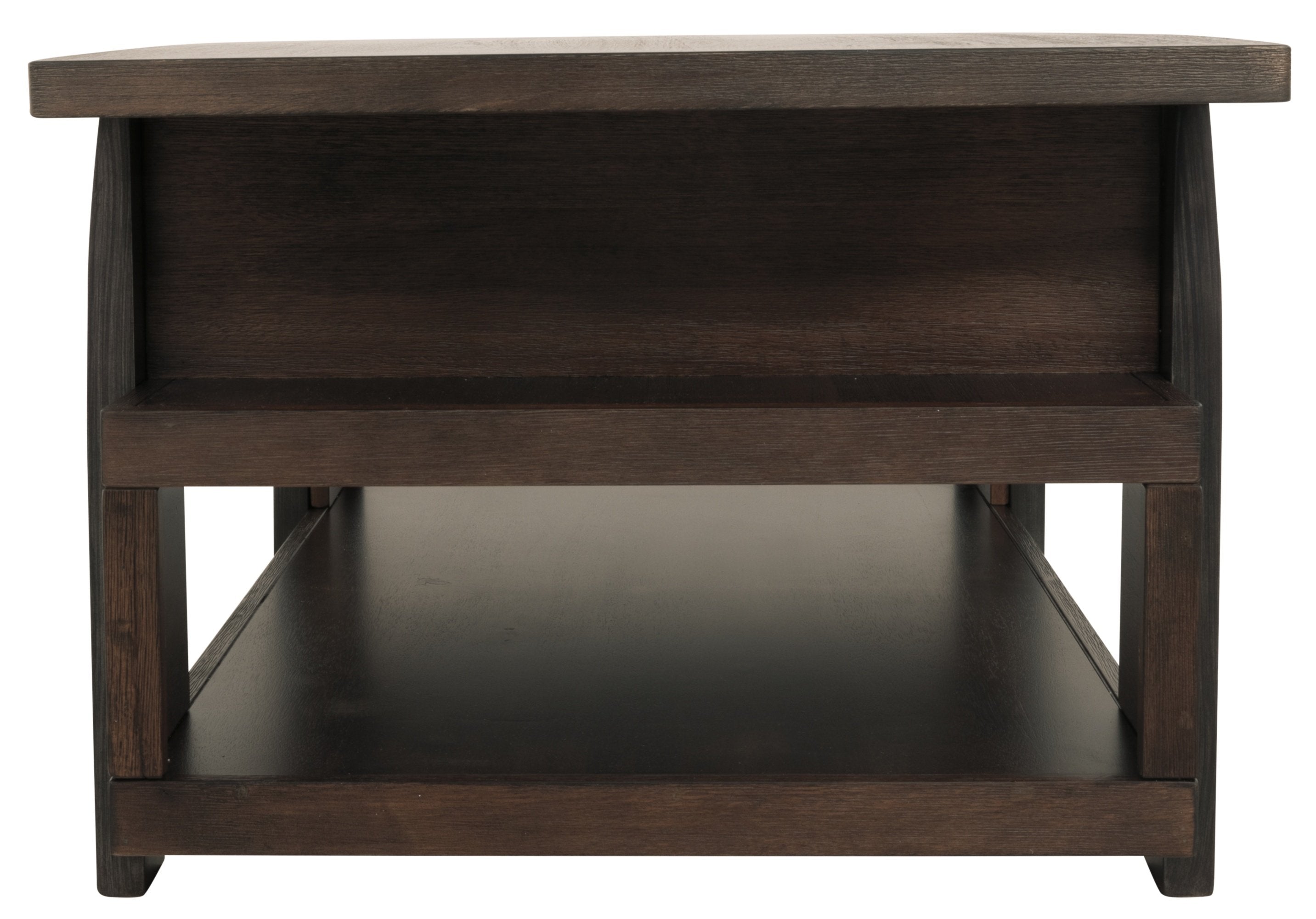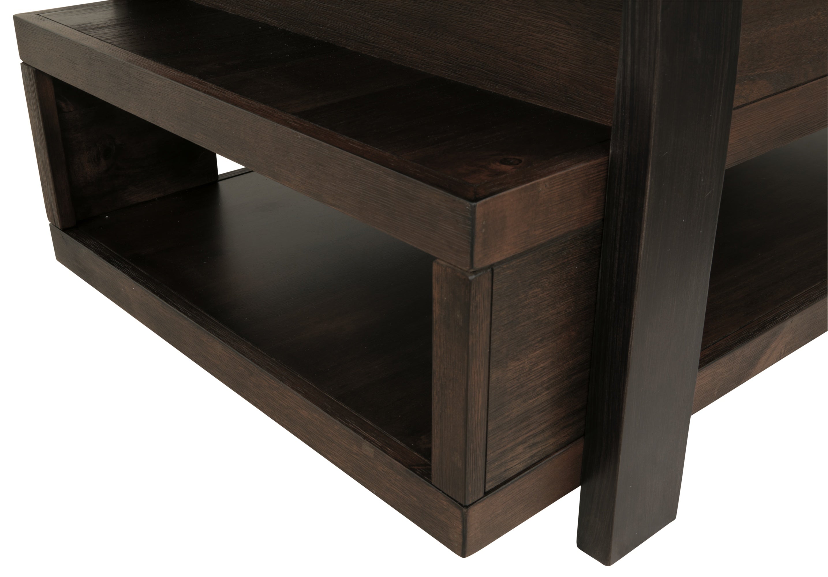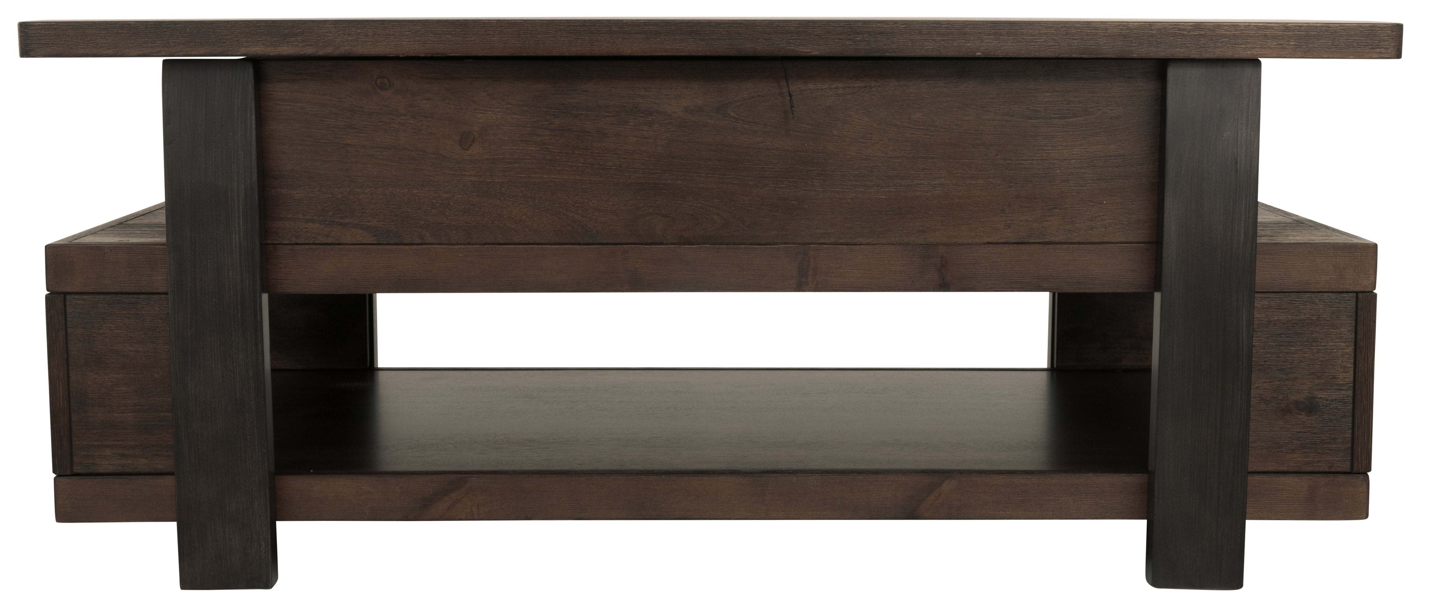 A table with form and function, and a whole lot of style, is what the Valibry lift top cocktail table is all about. Its handy lift top, open lower shelf and signature side shelves offer lots of convenient spots to keep the room's necessities. The distressed brown finish contrasts beautifully with the dark brown faux metal finished legs for a floating top look that's striking—quite a value for a style that will withstand the test of time.