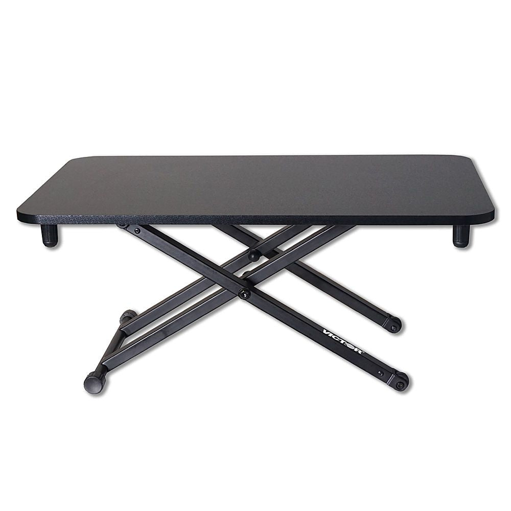 The Victor DCX110 is designed for laptop users that want the versatility and ease of a transportable standing desk. This easy-to-use space-saving laptop standing desk is perfect for use at home or in the office. Quickly raises to 16 with the squeeze of a lever. The two wheels on the legs make the adjustment from sitting to standing smooth and effortless. Measuring 28.75 wide by 18.5 deep the durable and scratch-resistant melamine work surface provides plenty of space to accommodate your needs. It is ready to use out of the box and takes seconds to setup. The lightweight design makes it easily transferrable and it is portable and easy to store. Add the DCX110 to your dorm room bedroom or small office space. Can accommodate a single monitor setup as well.