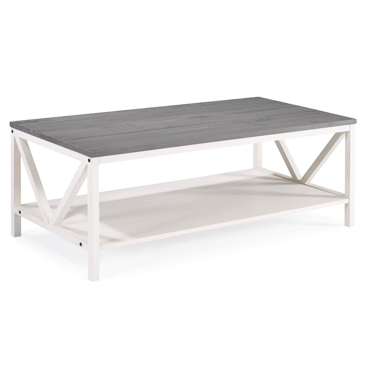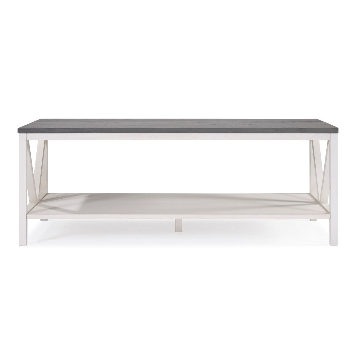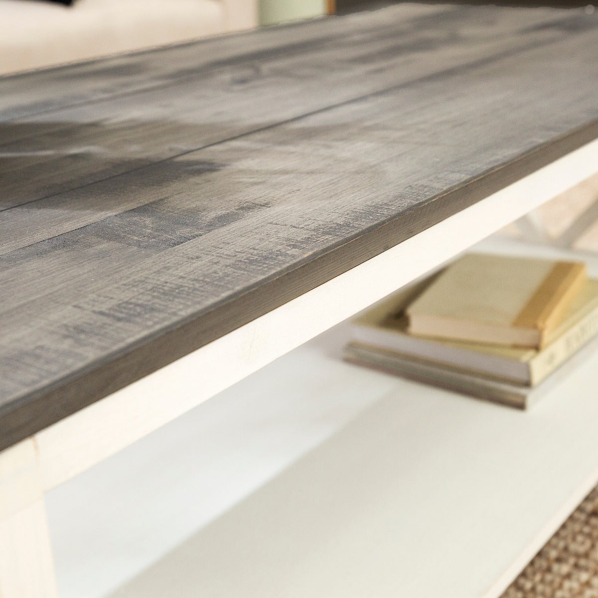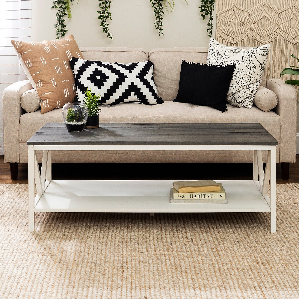 Complete that cozy home feeling with this 48 two-tone farmhouse style coffee table. This piece is ideal for both entertaining and every day cares. Whether you use it as a cocktail table or a spot to serve after school snacks, the distressed solid wood table top will impress you with its durability. The solid wood legs with a trestle like detail also increase the stability and character of this wood accent table. And as a final touch, this rectangle coffee table also features a lower shelf made of high-grade MDF for storage.
