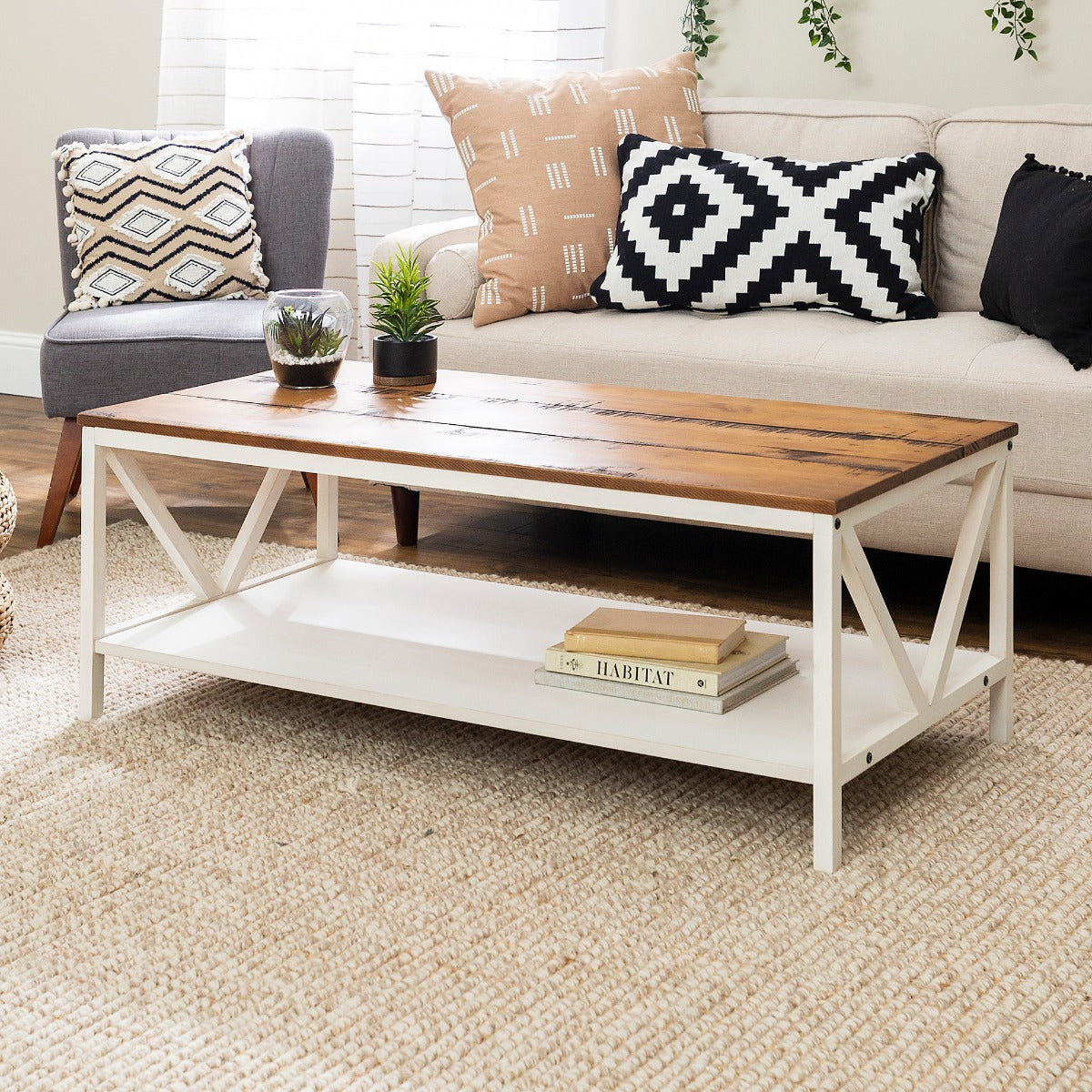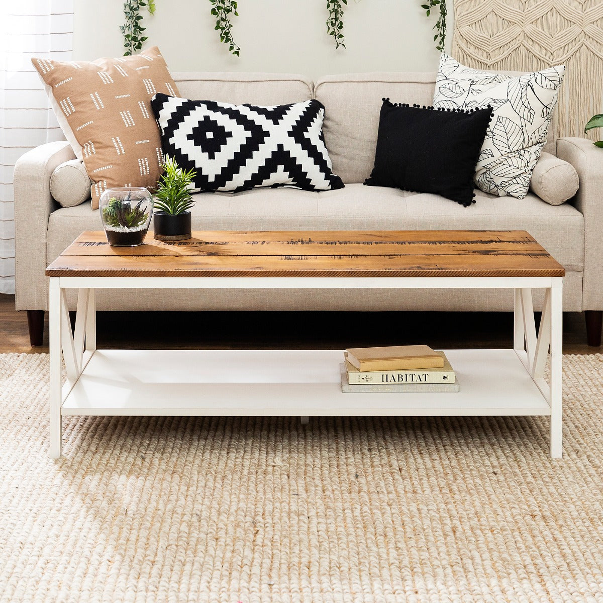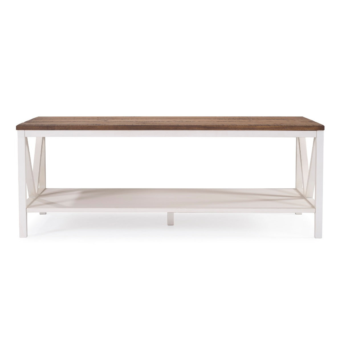 Complete that cozy home feeling with this 48 two-tone farmhouse style coffee table. This piece is ideal for both entertaining and every day cares. Whether you use it as a cocktail table or a spot to serve after school snacks, the distressed solid wood table top will impress you with its durability. The solid wood legs with a trestle like detail also increase the stability and character of this wood accent table. And as a final touch, this rectangle coffee table also features a lower shelf made of high-grade MDF for storage.