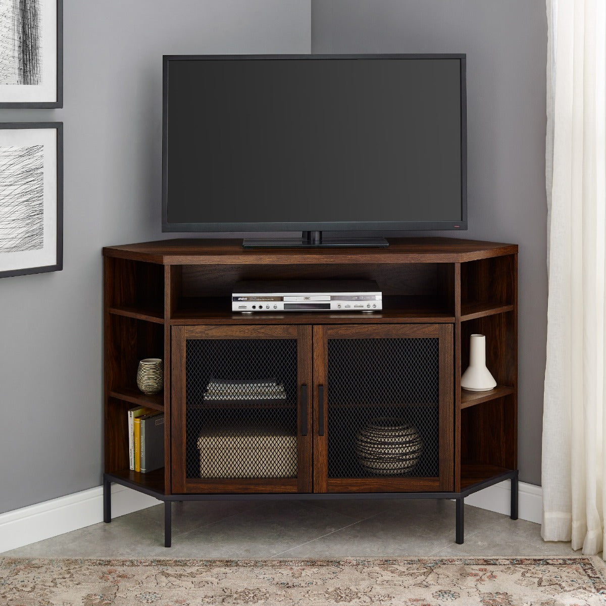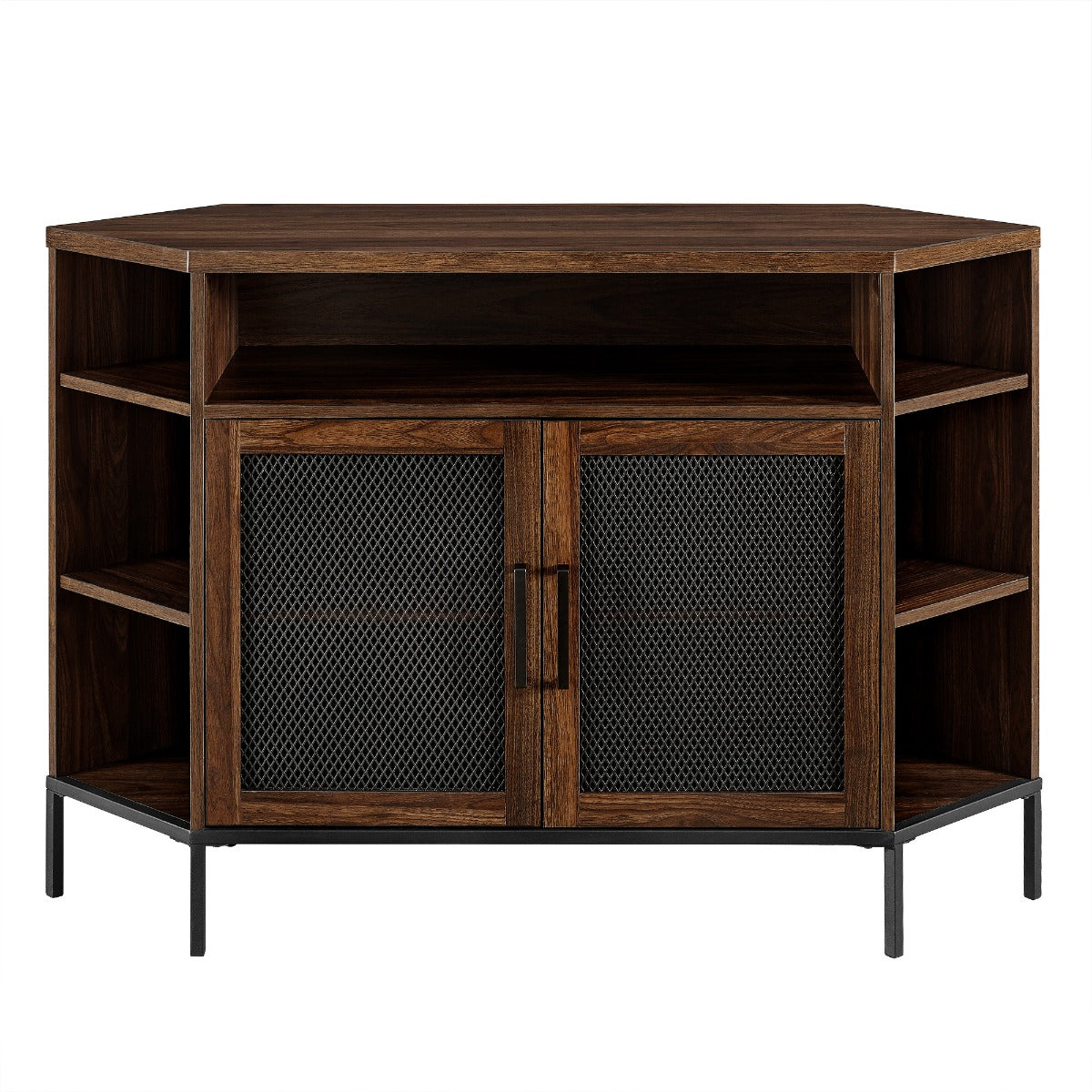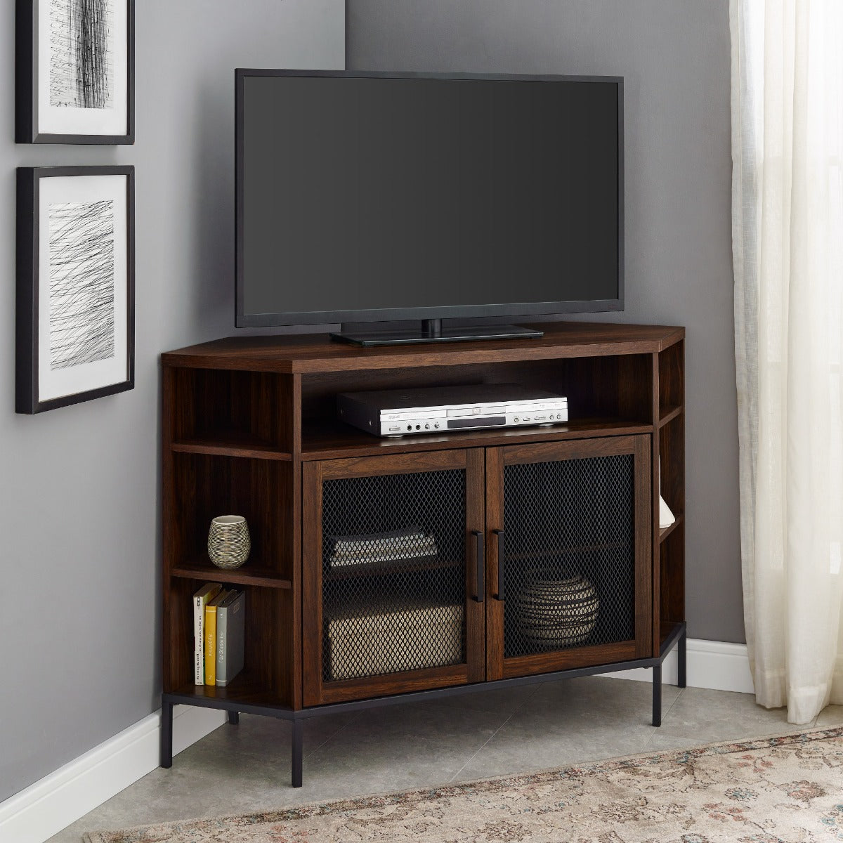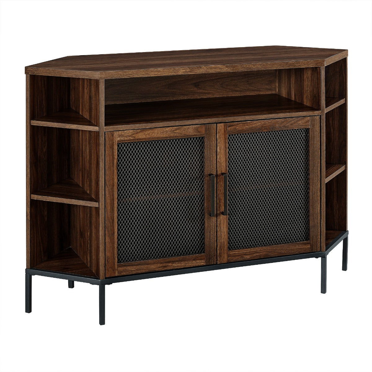 Insert an industrial accent console into your home with this 48 corner TV stand. It has mesh metal cabinet doors and powder coated metal legs that add an urban edge to this sturdy and affordable entertainment cabinet. Behind the two-doors are adjustable shelves while the shelves on either side of the unit are fixed. Designed to fit in the corners of you room, this media console also comes with a wall anchor hardware for extra stability. This entertainment stand accommodates TVs up to 52-inches.