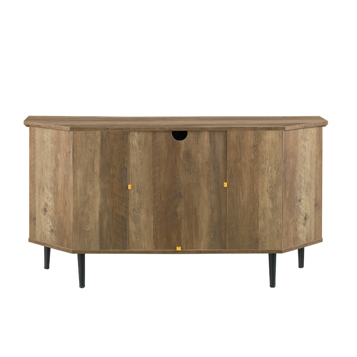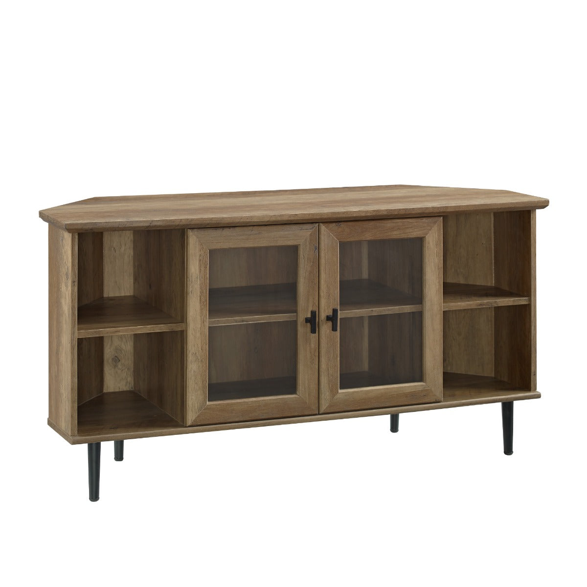Despite its plain design, this corner TV console isn’t something you can ignore. Clean lines create a minimal media stand that functionally stands out. This basic entertainment console is angled to fit in corners, accommodate TVs up to 52-inches, and has a combination of open and closed storage. The sides of this TV console feature adjustable shelves. Behind the tempered glass doors with adjustable metal hinges there is one fixed shelf, providing multiple storage options for your media and souvenirs. As a final bonus this simple corner stand has rubber feet that protect your floors.