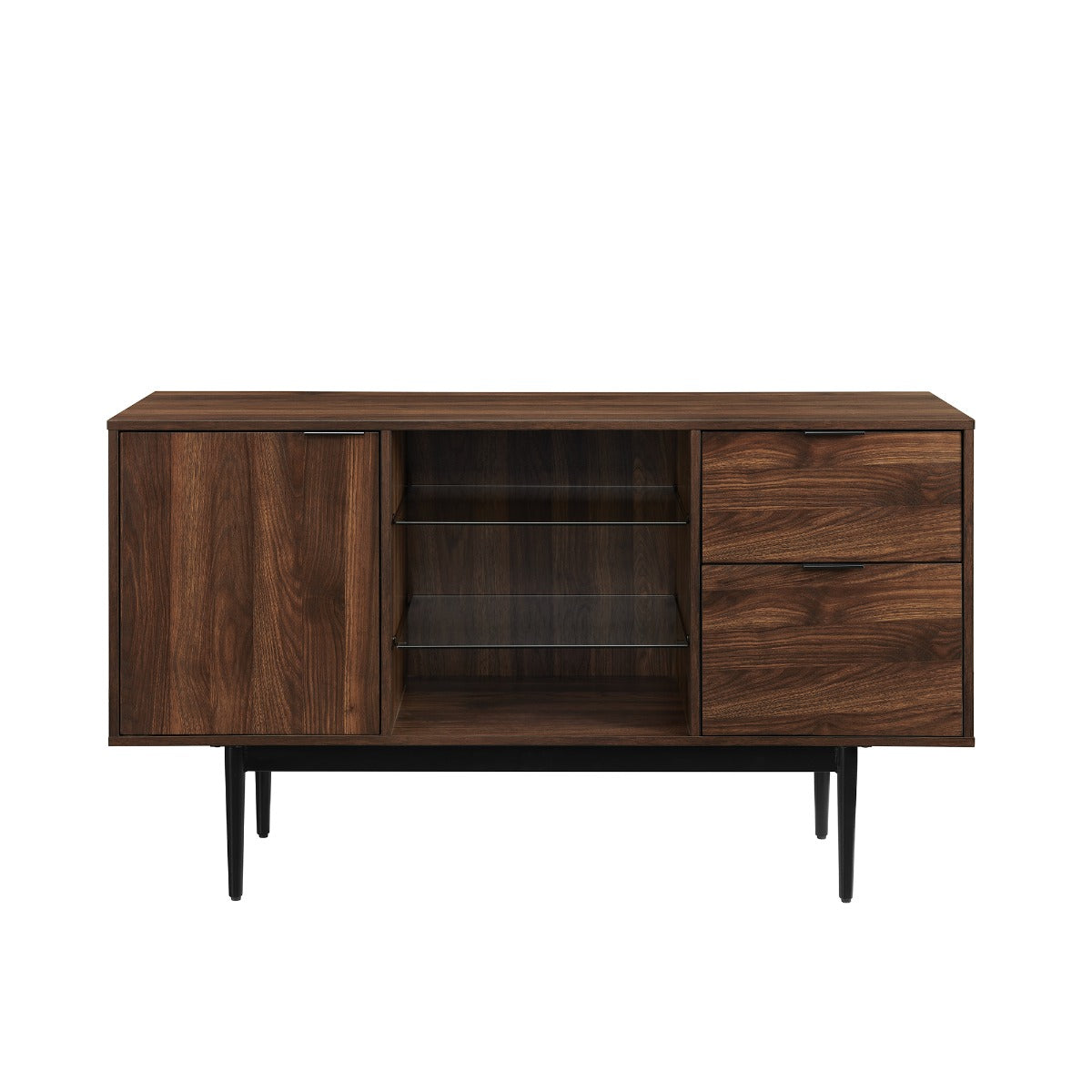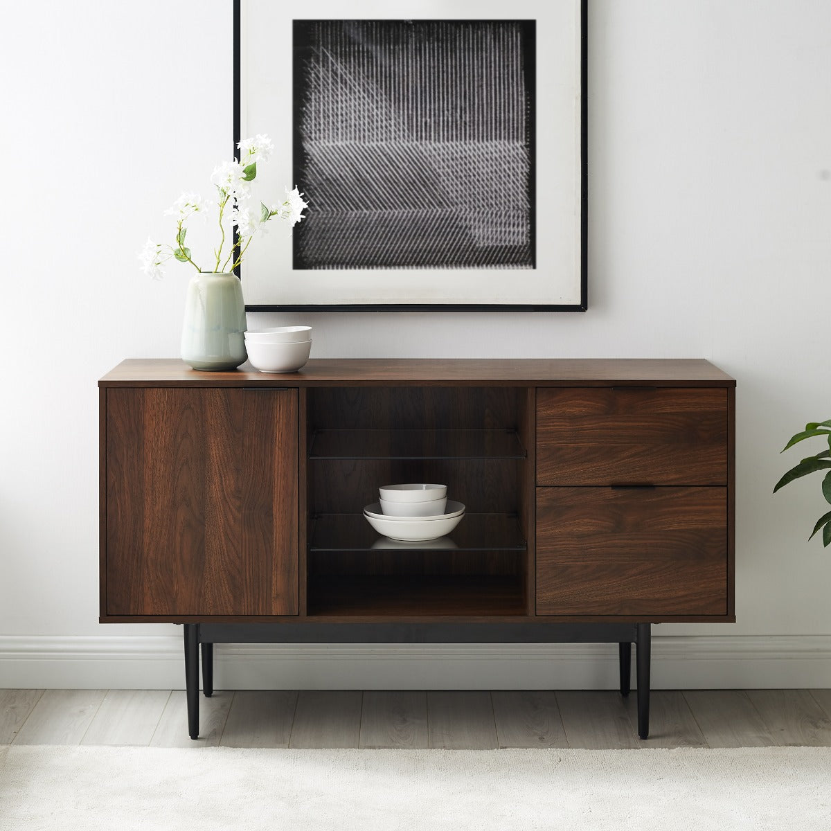 Modern. Mixed-material. Sideboard. If that short description of this incredible media stand doesn’t have you sold, just take a look at the plethora of storage options for your books, blankets, and other living room essentials. Two awesome adjustable glass shelves display photos from your travels or electronic consoles. Tuck clothing or board games away in the two convenient side drawers. And if that isn’t enough, one door hides another adjustable shelf perfect for movies or books. Don’t worry about sacrificing style for functionality: this two-tone storage console has tapered metal legs and flat handles for a trendy design that elevates any bedroom or living room. This is no hyperbole: the mid-century buffet is simply astounding. You’re welcome.