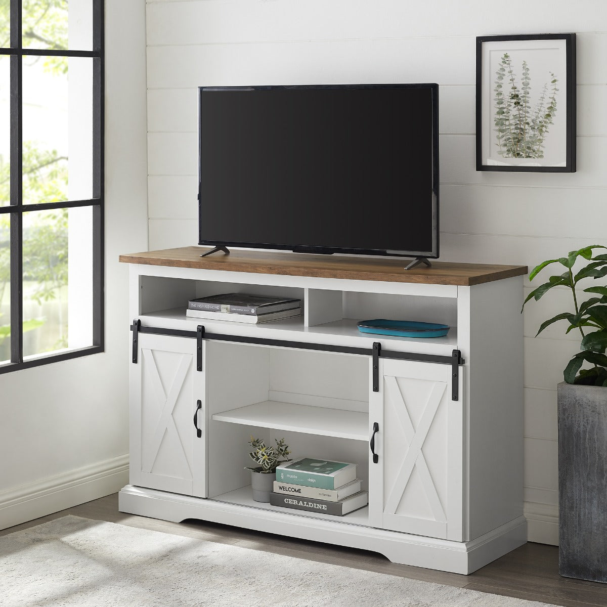 Design your home with the storage space you need by incorporating this 52-inch TV stand into just about any room. With a versatile design, this TV stand can be utilized not only as an entertainment center in your living room, but as either a buffet in your kitchen or a storage cabinet in your bedroom. With plenty of storage space provided, from the open shelving and closed shelving with sliding barn cabinet doors. Position the sliding doors in the center or sides, with your media, electronics, accessories, glassware, or décor on the shelves. Including adjustable shelves and cord management to keep your room essentials organized and in one spot. Crafted of high-grade MDF, durable laminate, and metal for a modern farmhouse and traditional style. Can fit up to a 56-inch TV.