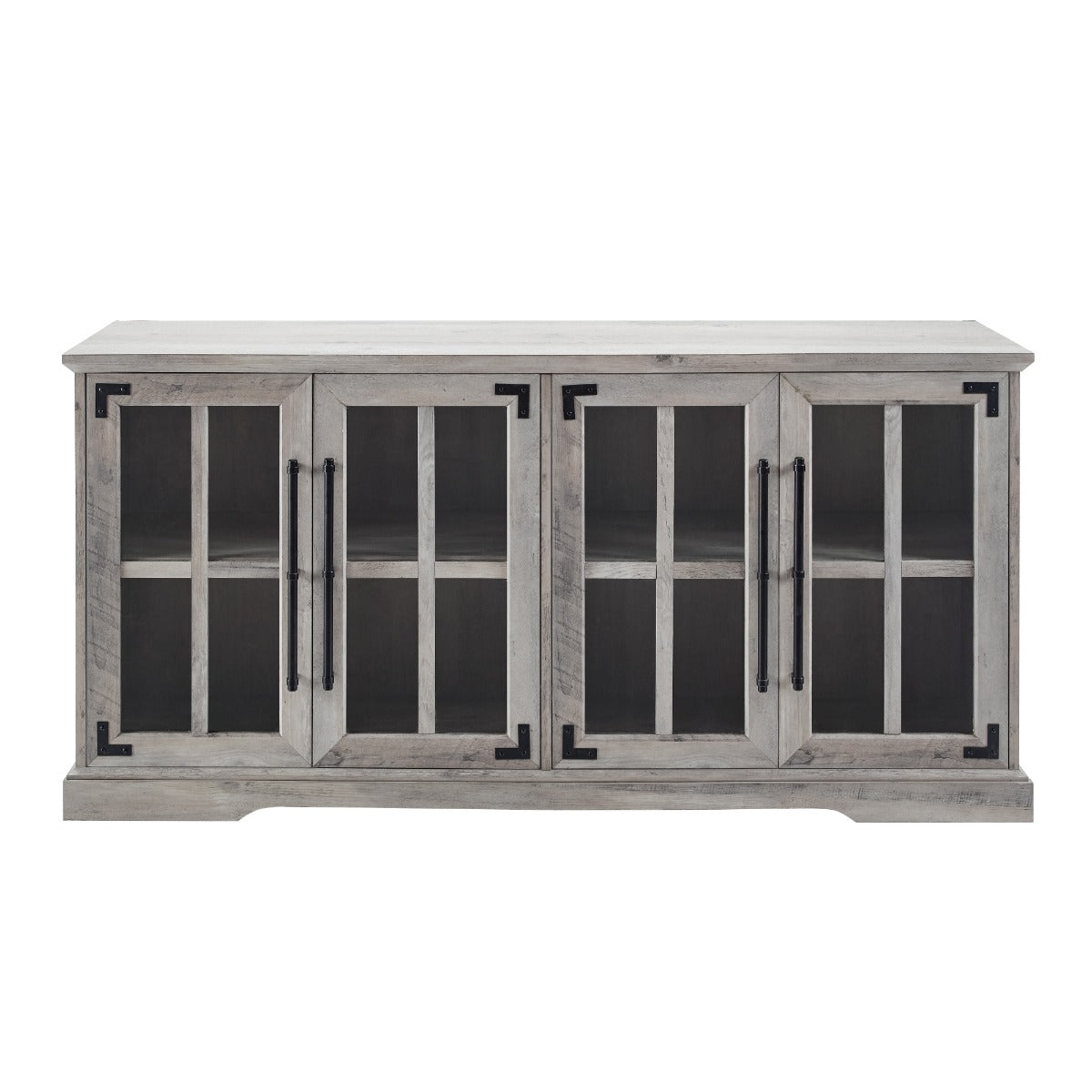 Country flair for the current age, this farmhouse TV stand has a historic presence mixed with all the modern modifications necessary to make this a dream entertainment stand. It has adjustable shelves and cord management options so you can organize electronics to your preference. Four tempered glass doors with a classic fretwork design feature metal corner accents that incorporate a rustic element to into this traditional console. The doors also have soft close hinges. A beveled top and bottom add the final touches to this charming country style media stand.