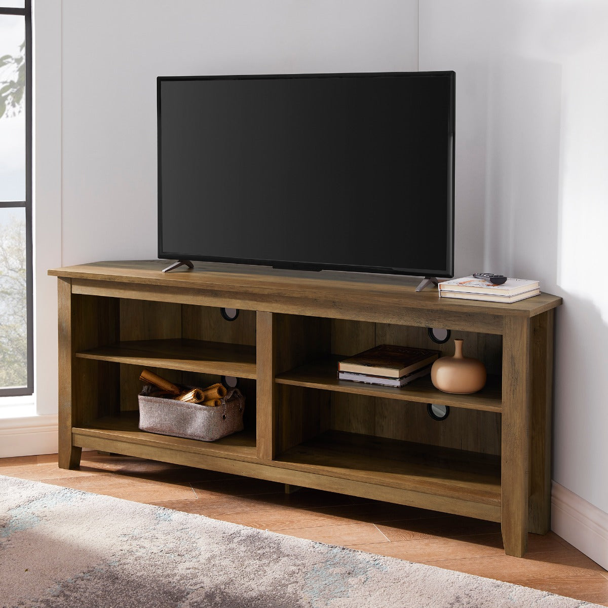 With a simple design, this corner media console pairs well with any variety of room style. Made of durable, high-grade MDF, this transitional style TV stand can accommodate most flat-panel TVs up to 60 inches and includes a cable management system to keep your living room tidy. This entertainment stand includes four compartments of open storage divided by adjustable shelves, so you can easily store gaming consoles, speakers, or your favorite movies.