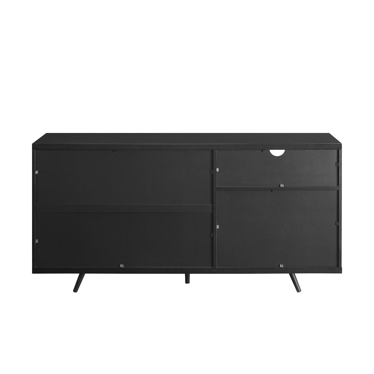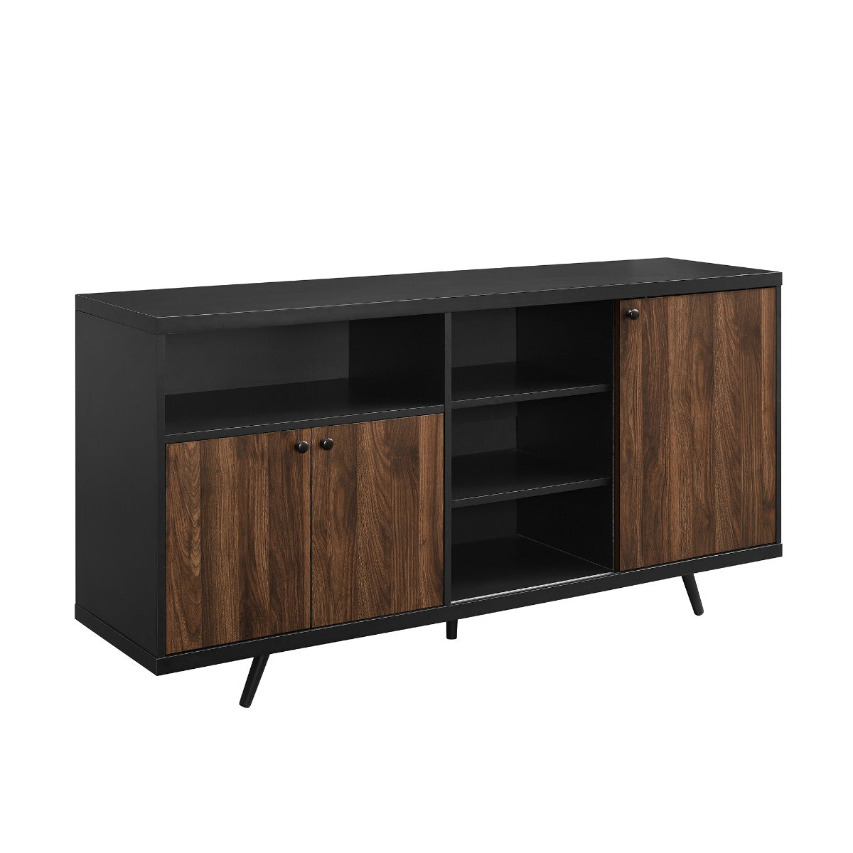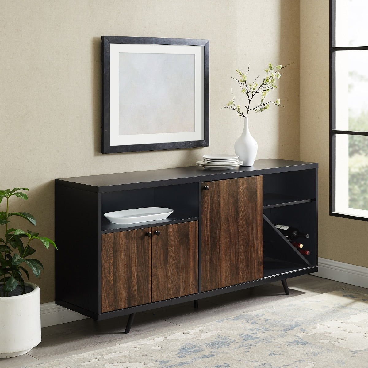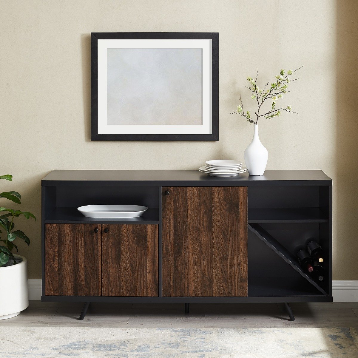 Surprise yourself with this dramatic two-tone sideboard. Open and closed storage will catch you off guard within every nook and cranny of this piece. On the top left of the unit there’s an open cubby. Underneath that, there are two doors that hide an adjustable shelf. The right side of this very modern, very hip storage cabinet features a sliding door that covers up some more shelves, including a removable, diagonal shelf that’s ideal for wine storage.