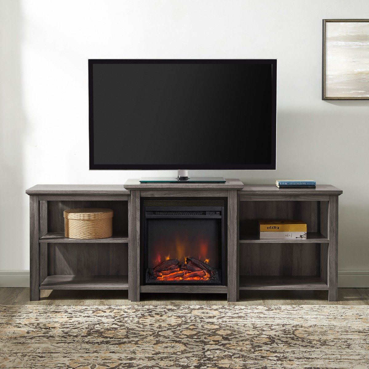 The epitome of simple perfection, this tiered open shelf TV console has everything you need. Fixed shelves with cord management holes help you organize consoles and cable boxes with ease, while the center of this classic media console features an 18 electric fireplace that plugs into a standard outlet. Two separate switches control the heat and LED flame lights so you can choose to have extra heat, extra ambiance, or the best of both worlds. This media console can accommodate TVs up to 78-inches.