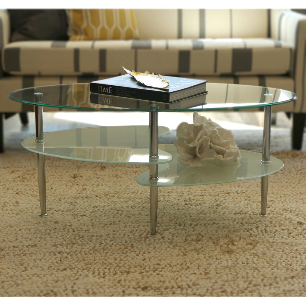 Features stylish sturdy design, oval-shape with distinct curving legs, beveled, tempered safety glass. Frosted finish on lower shelving. Sparkling steel legs. Ships ready-to-assemble with step by step instructions.