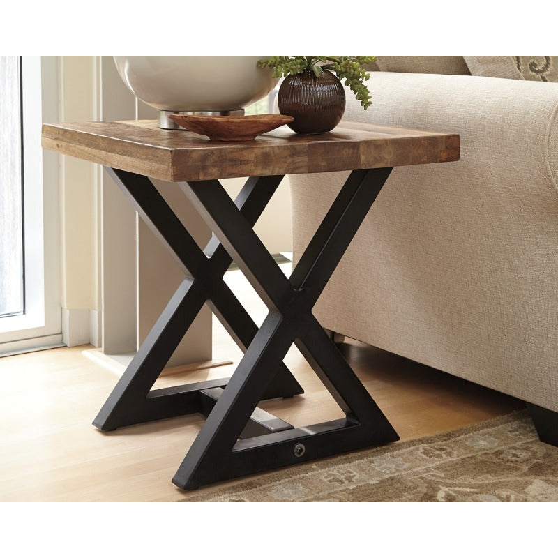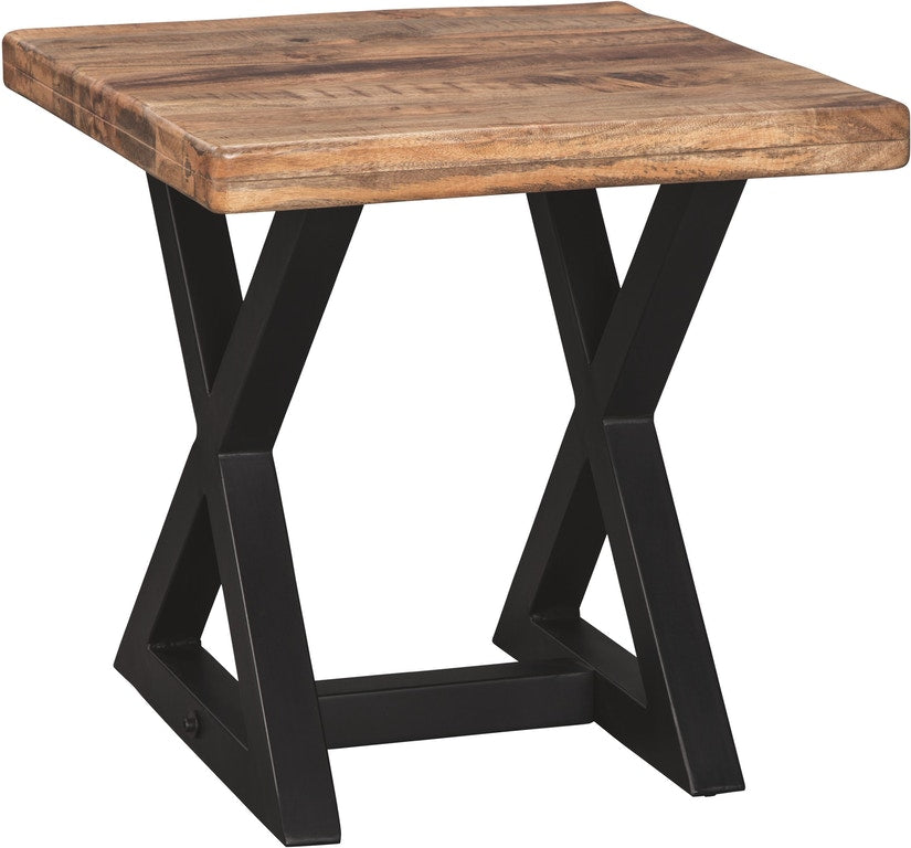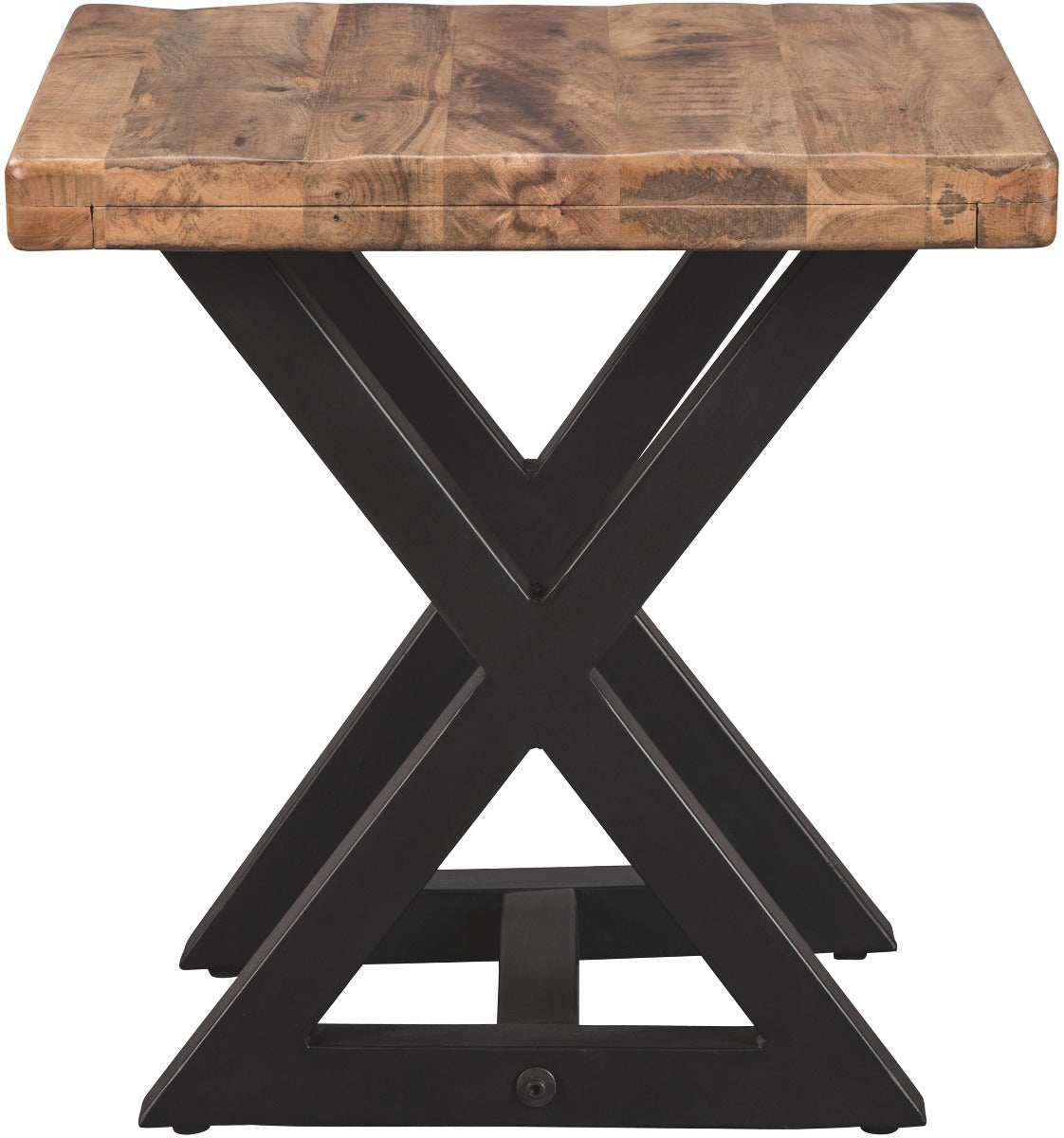 Topped with a rich, thick slab of sustainable mango wood, bathed in a light rustic finish, Wesling end table wows with clean-lined style and a hearty presence. Classic X-brace base with stretcher is crafted of a contrasting metal for a merge of mixed media elements and a touch of modern industrial.