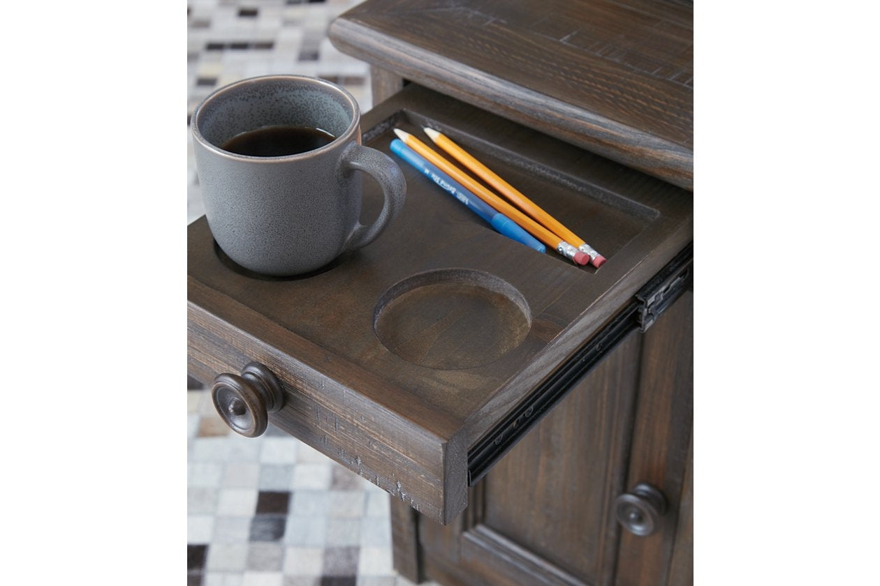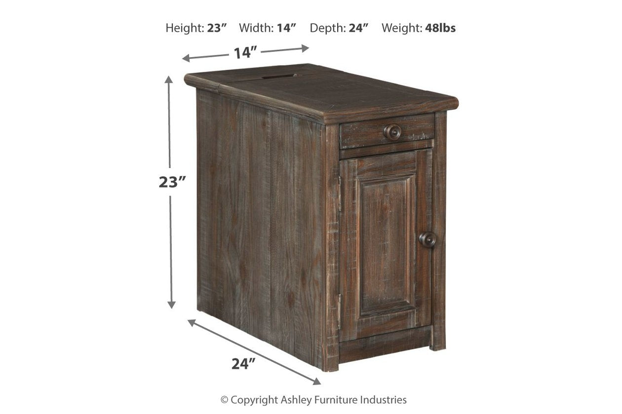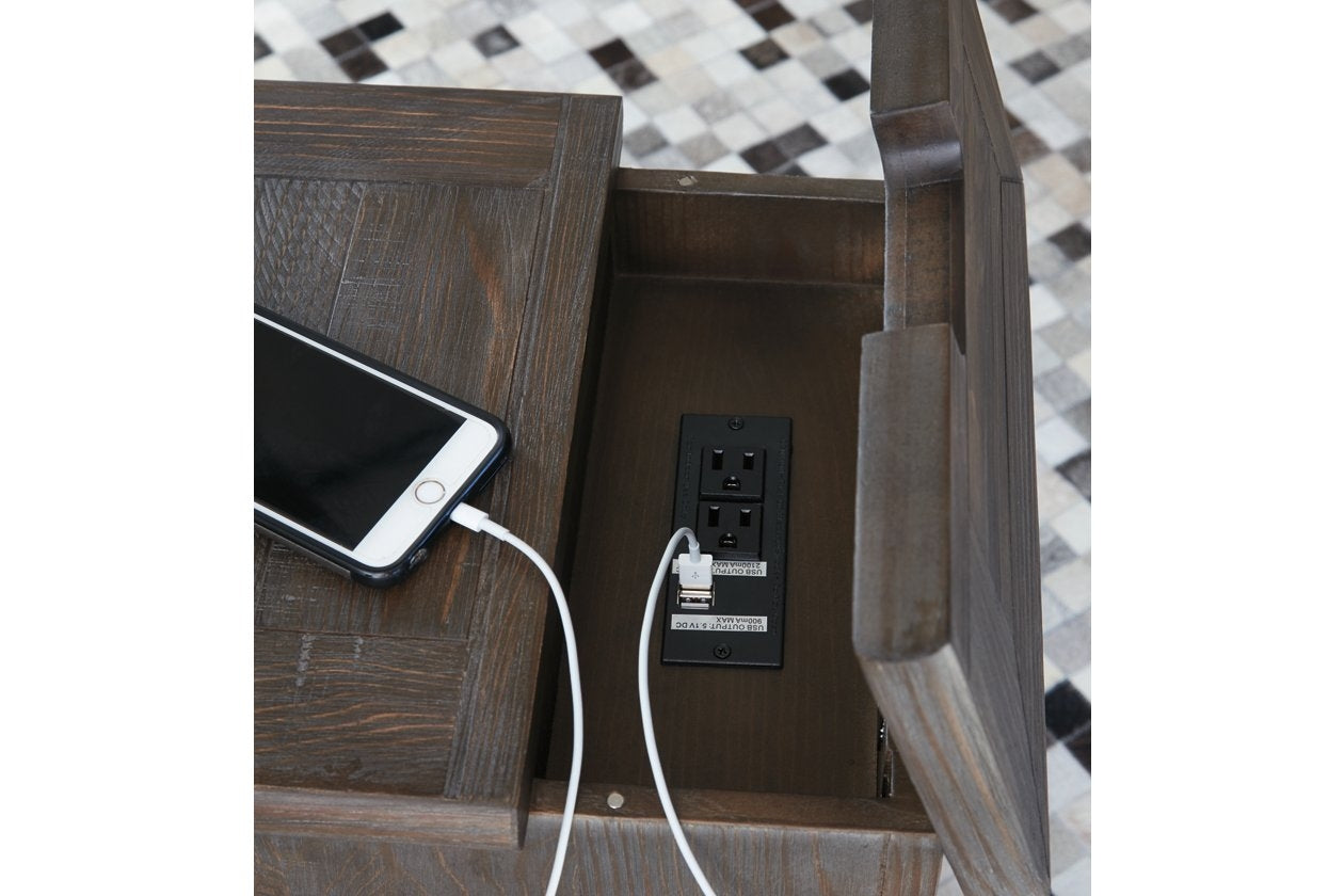 Inspired by heavy and hearty lodge-style furnishings from days gone by, this chairside end table brings the past brilliantly into the present. Distinctive details include robust mouldings and a distressed aged pine color finish with light wire-brushed texture that's pure artistry. Addition of cleverly placed AC power and UBS plug-ins makes this yesteryear-inspired end table made for the here and now.