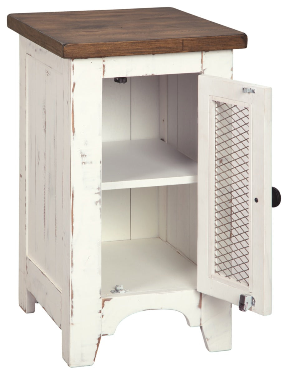 Double take. Sporting a two-tone finish that pairs a distressed vintage white with aged natural pine color, this chairside end table elevates the art of rustic farmhouse living. Enhancing its charm: shelved storage visible through the cabinet door with inset metal grill.