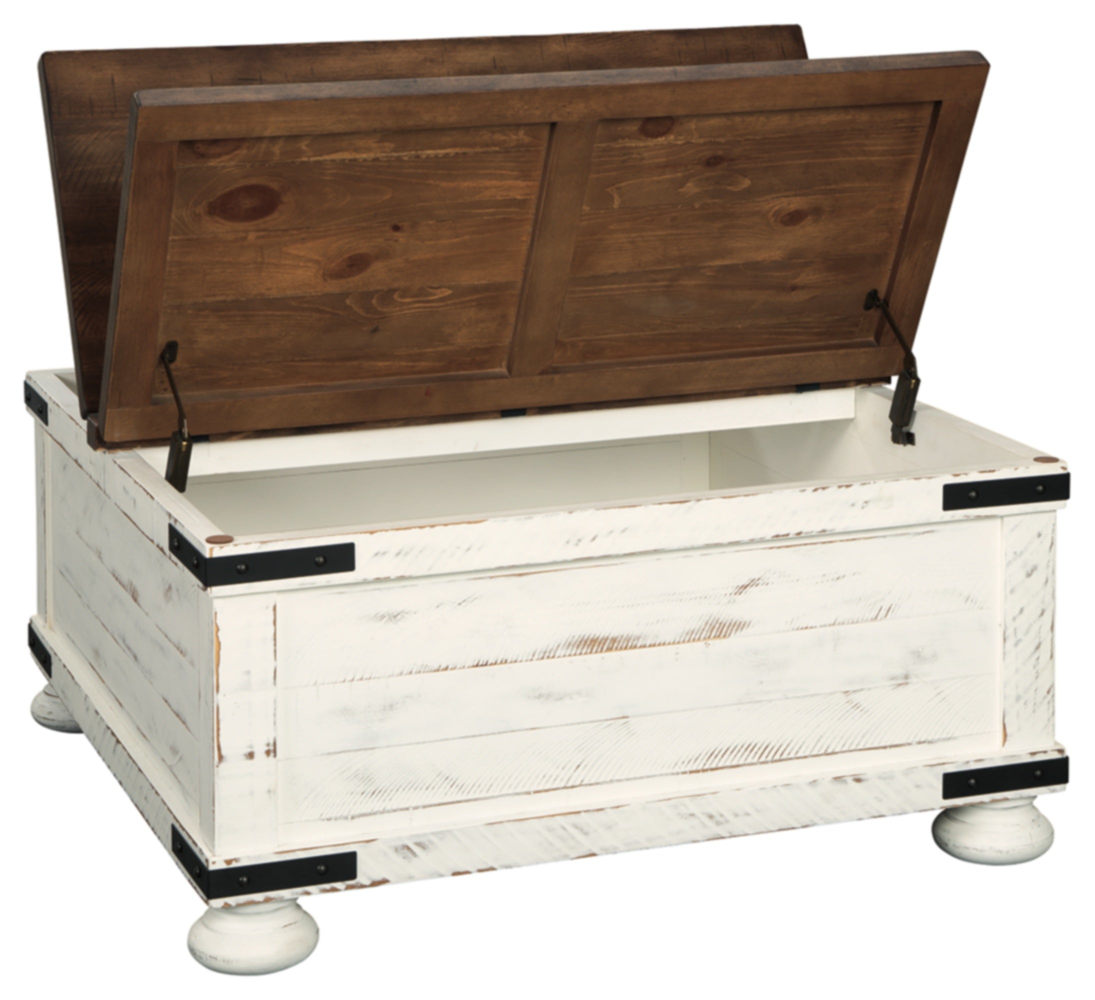 Double take. Sporting a two-tone finish, dual-sided lid design and expansive storage space, the Wystfield square coffee table takes the art of rustic farmhouse living to a new level. Designer touches include plank-effect styling, heavy distressing and industrial bracket hardware.